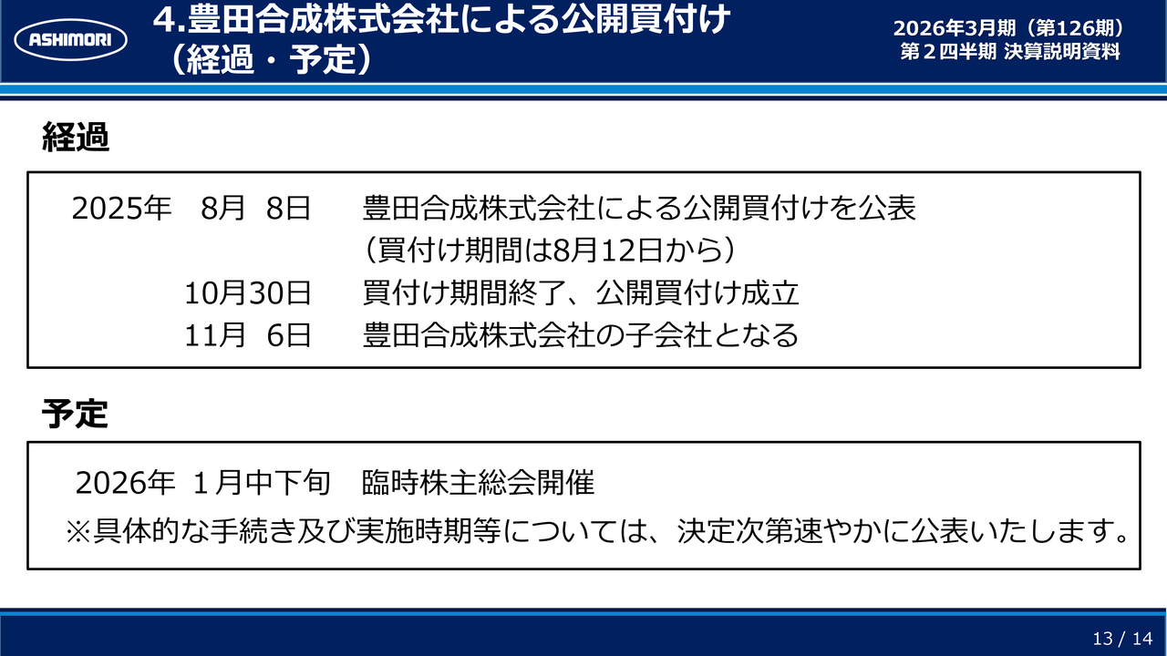 最後に、豊田合成株式会社が2025年8月12日から実施していました当社株式に対する公開買付け(TOB)についてご説明します。