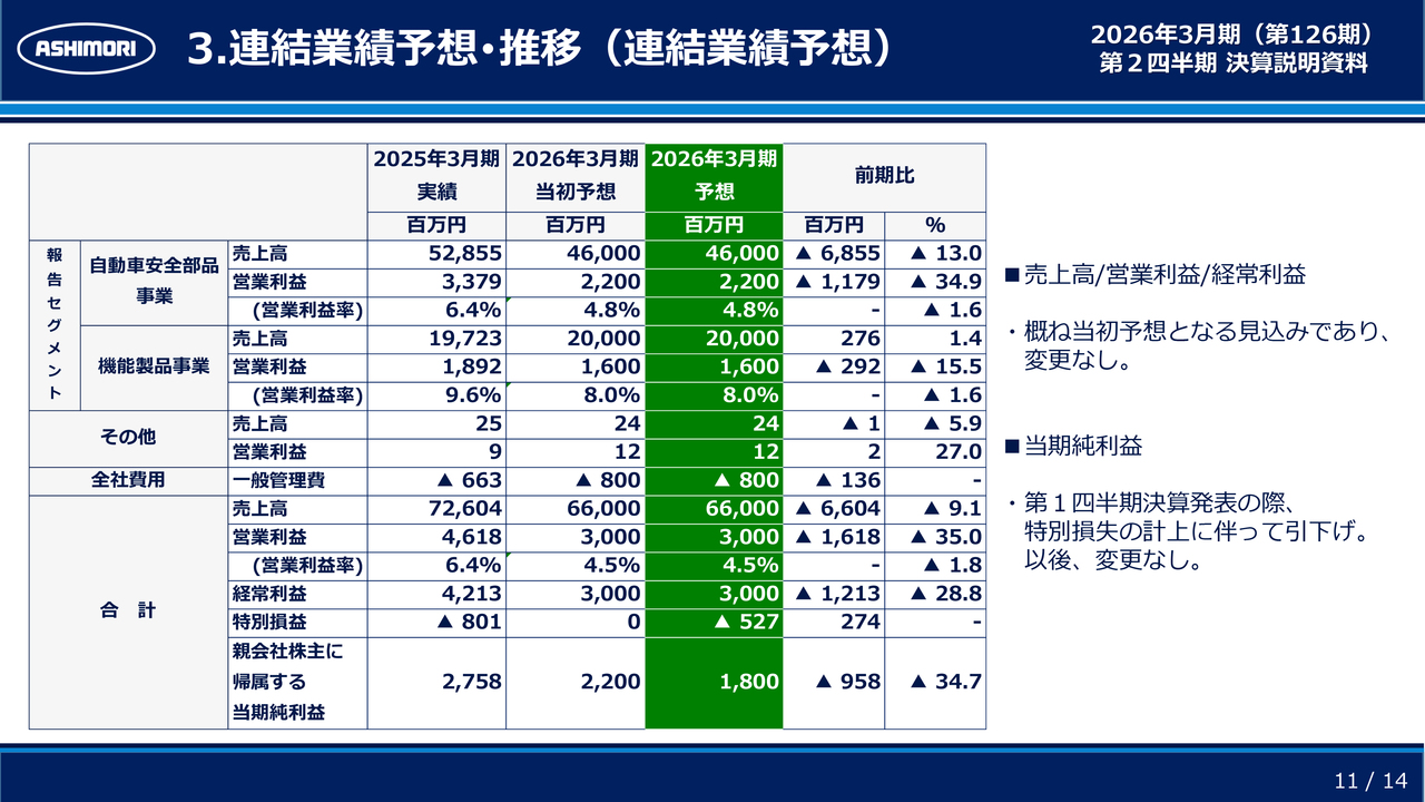 当期純利益についても、第1四半期決算発表の際に特別損失の計上に伴って引下げを行いましたが、それ以降変更はありません。