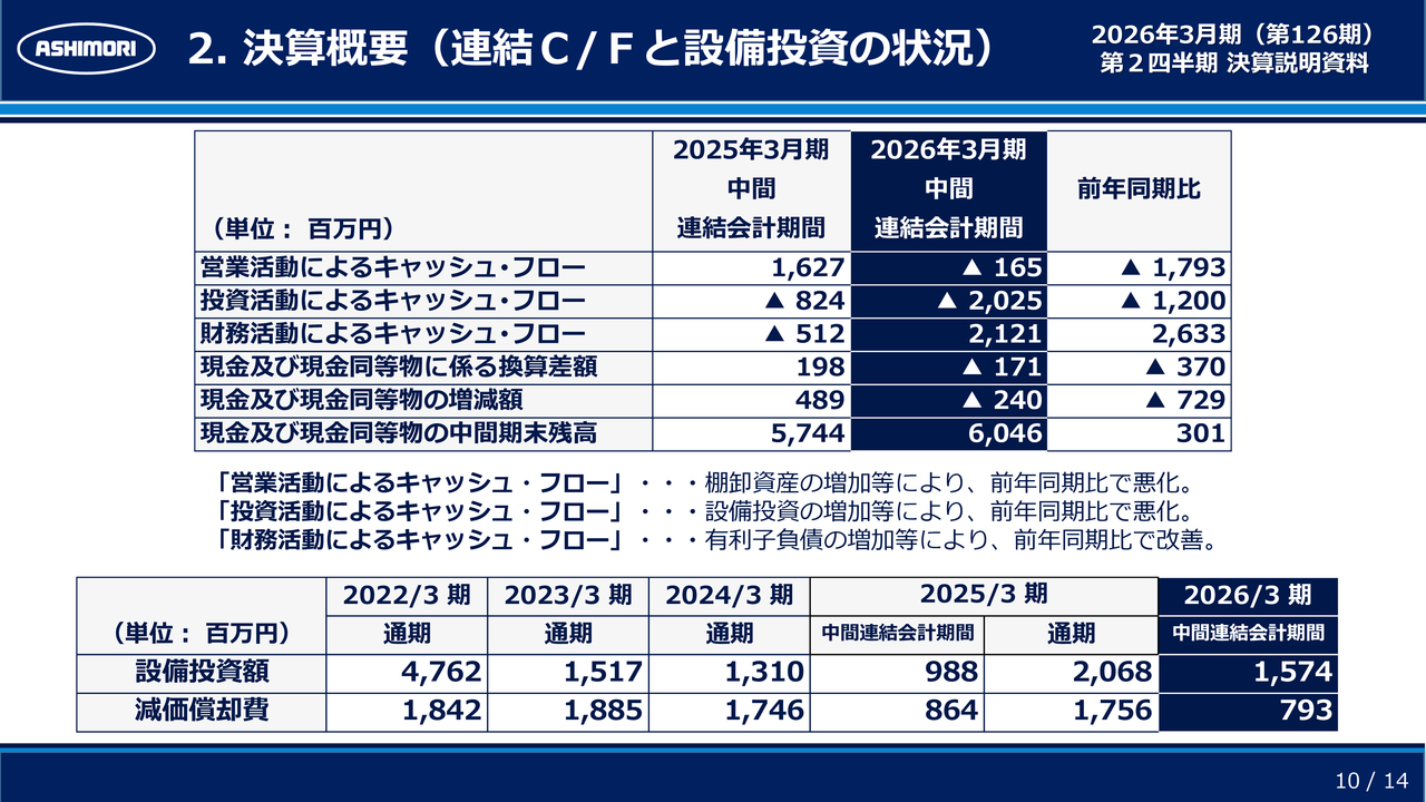 連結キャッシュ・フローの状況と、設備投資の状況です。「営業活動によるキャッシュ・フロー」については、棚卸資産の増加等により、前年同期比で悪化しました。