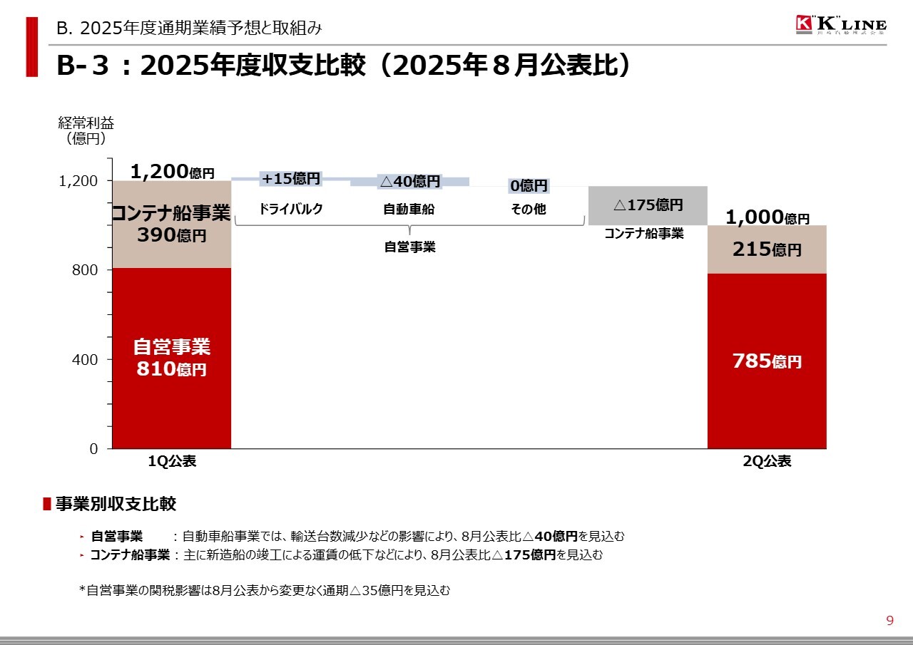 自営事業全体では、前回8月公表の810億円から25億円減少し、785億円の見通しです。コンテナ船事業では、先ほどご説明した影響などにより175億円の減益を見込み、通期で215億円の経常損益を見込んでいます。