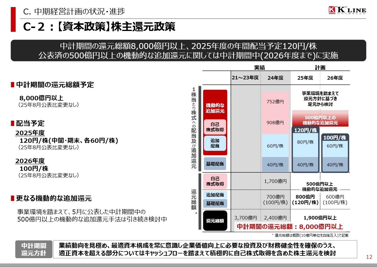 したがって、最新のキャッシュアロケーションを踏まえたうえで、2025年度の配当予定は基礎配当40円、追加配当80円の合計120円とする予定であり、中期経営計画期間の還元総額8,000億円以上にも変更はありません。