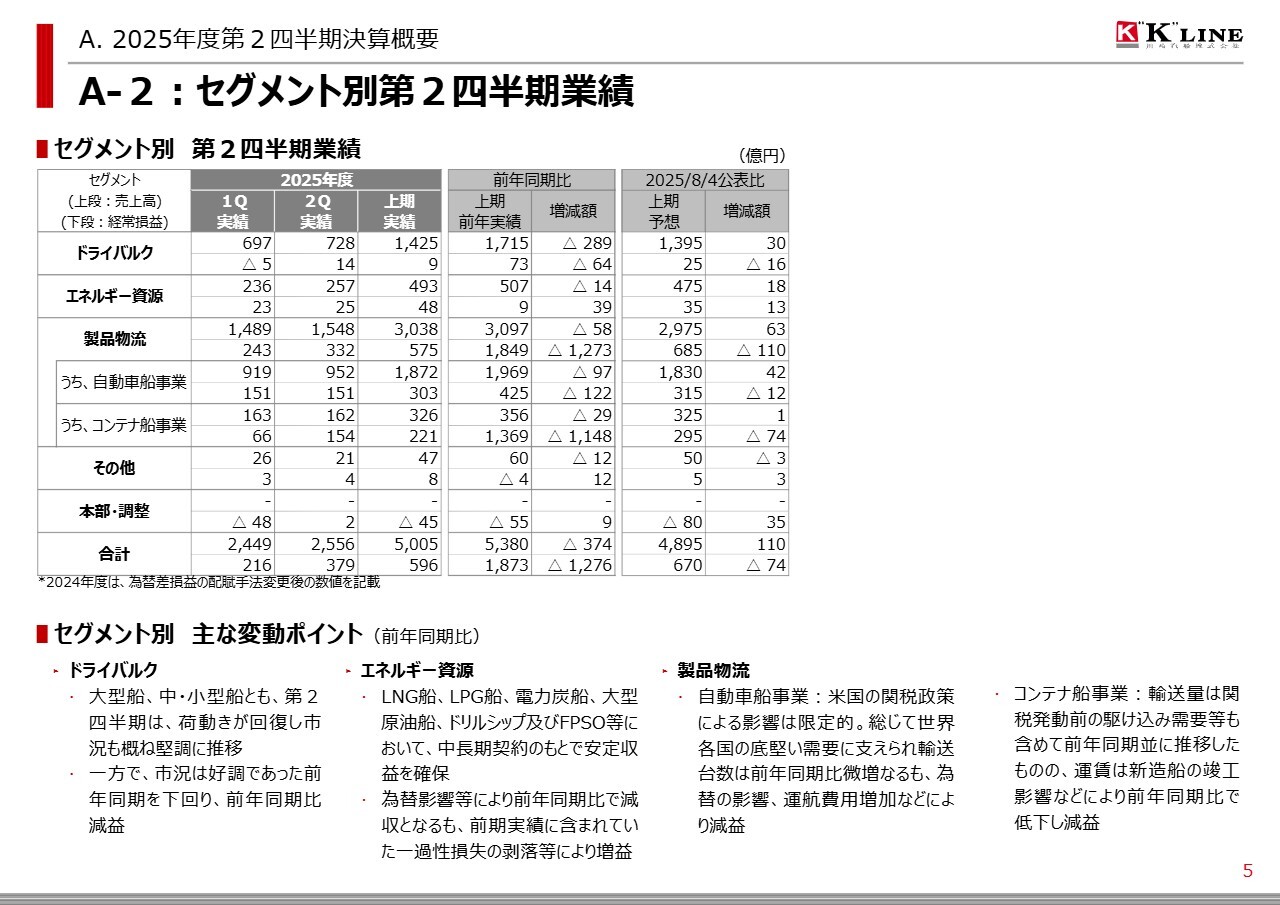 セグメント別の状況については、次ページのスライドに記載しています。2025年度第2四半期実績は、前年同期比で7.71円の円高となった為替の影響、自動車船の運航費用の増加、ドライバルク市況が好調だったものの前年同期を下回ったことなどにより、営業損益が減益となりました。