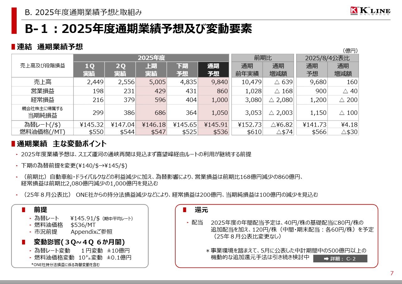 2025年度通期の業績予想及び変動要素です。まず、予想の前提として、2025年度は自営事業とコンテナ船事業の両方において、スエズ運河を通峡せず、喜望峰経由としています。