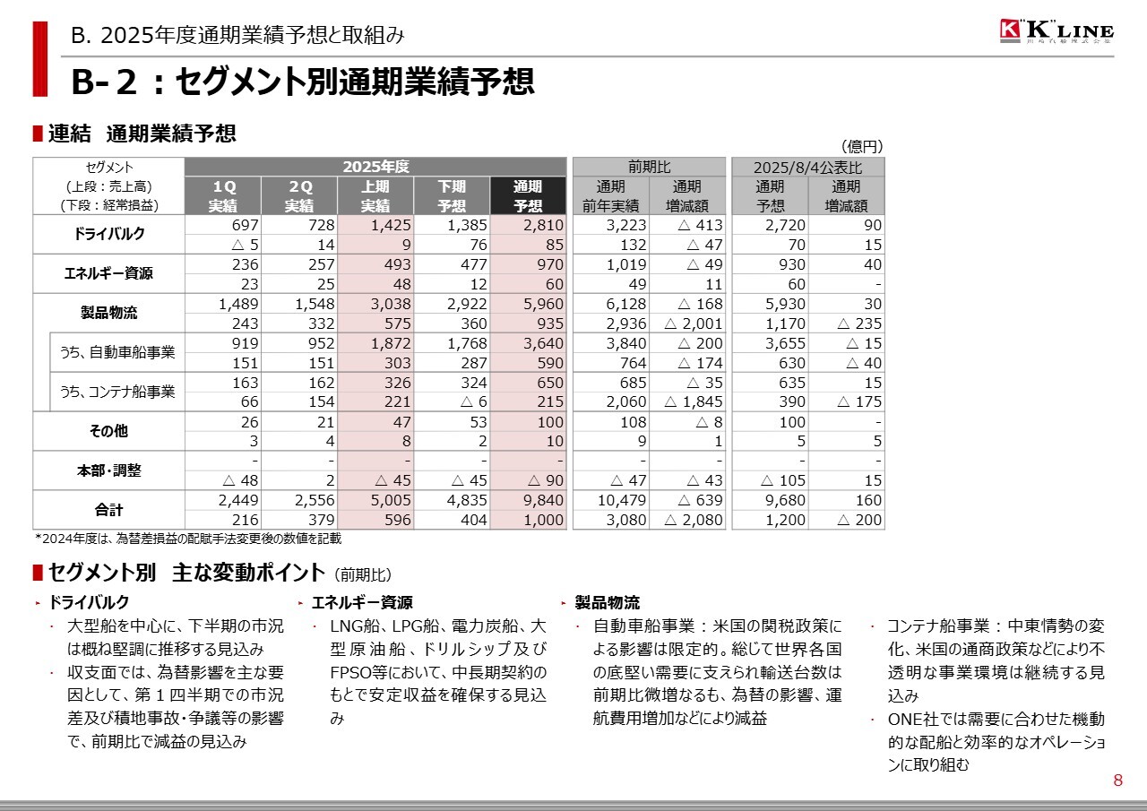 製品物流セグメントのコンテナ船事業では、2025年度後半は地政学的リスクや米国関税影響に加え、新造船の竣工による供給増加の影響で運賃市況が低迷すると予想しています。その結果、ONE社からの持分法投資損益が減少したことで、経常損益は前期比でマイナス1,845億円、前回8月公表比でマイナス175億円の215億円を見込んでいます。