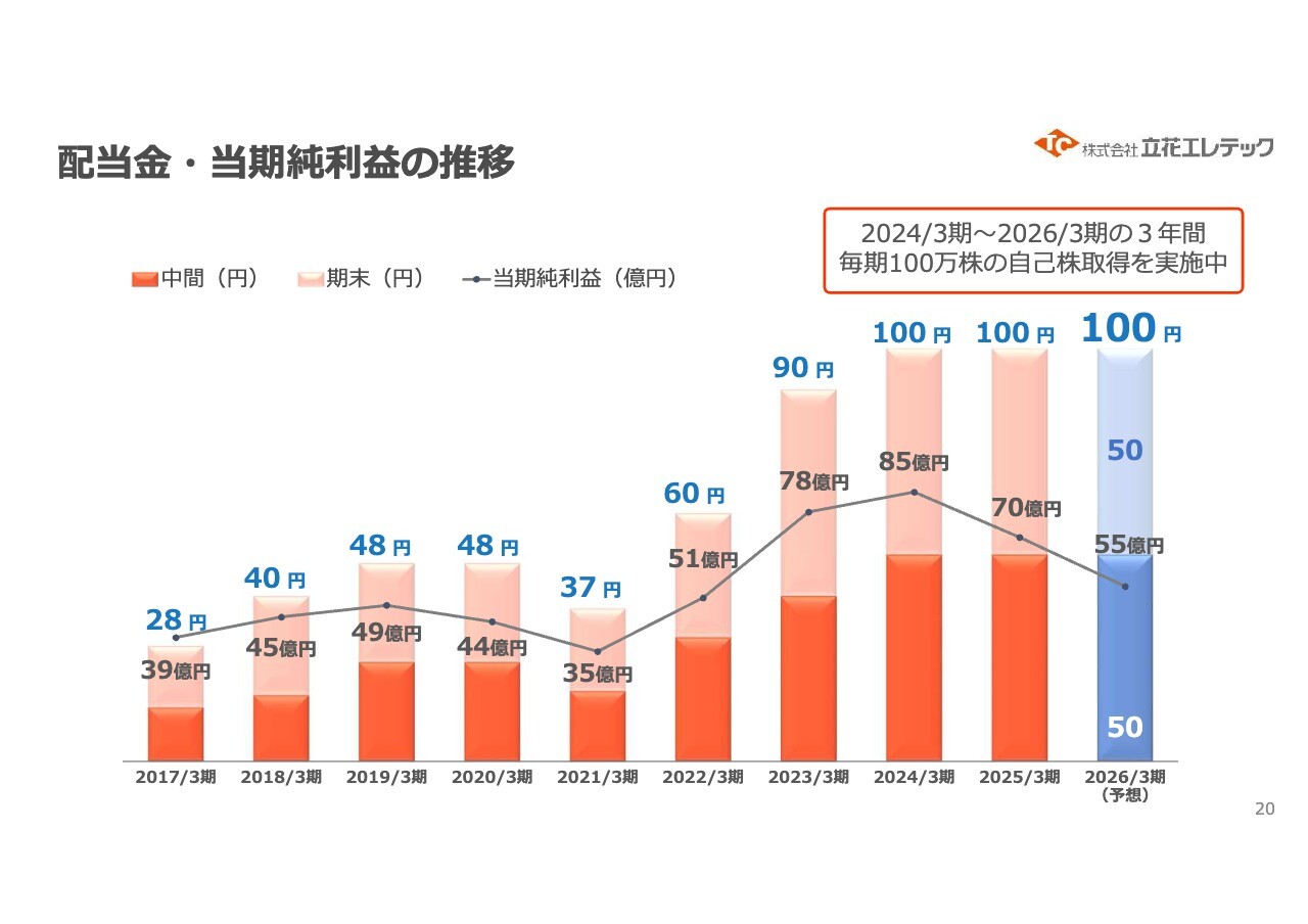 2026年3月期の配当金については、中間配当50円、期末配当50円を予定しており、2024年3月期から3年連続で年間100円の配当を維持する計画です。