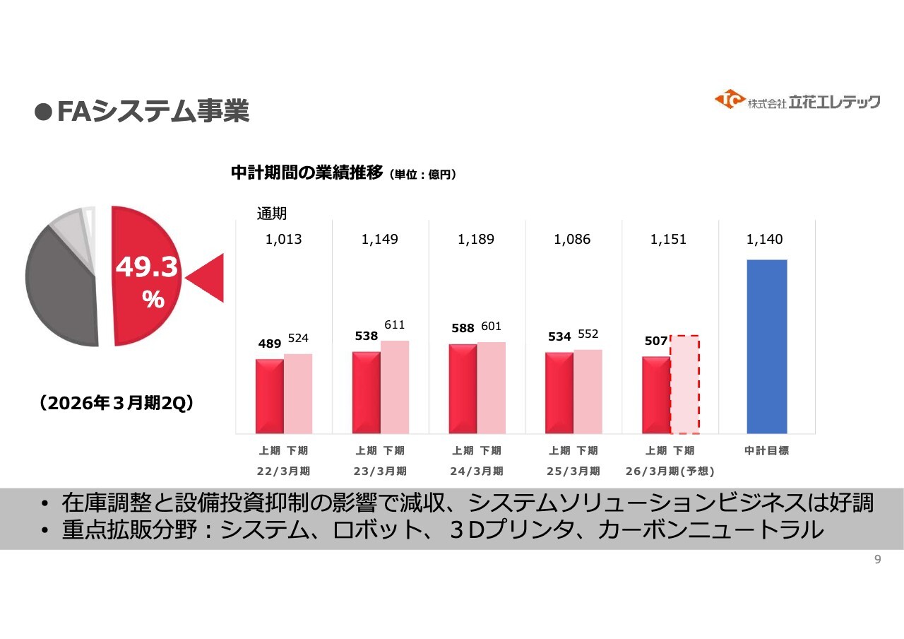 FAシステム事業の業績推移です。スライドの棒グラフは2022年3月期から示しています。2026年3月期には売上高1,151億円を予定しており、当社売上の49.3パーセントを占める見込みです。