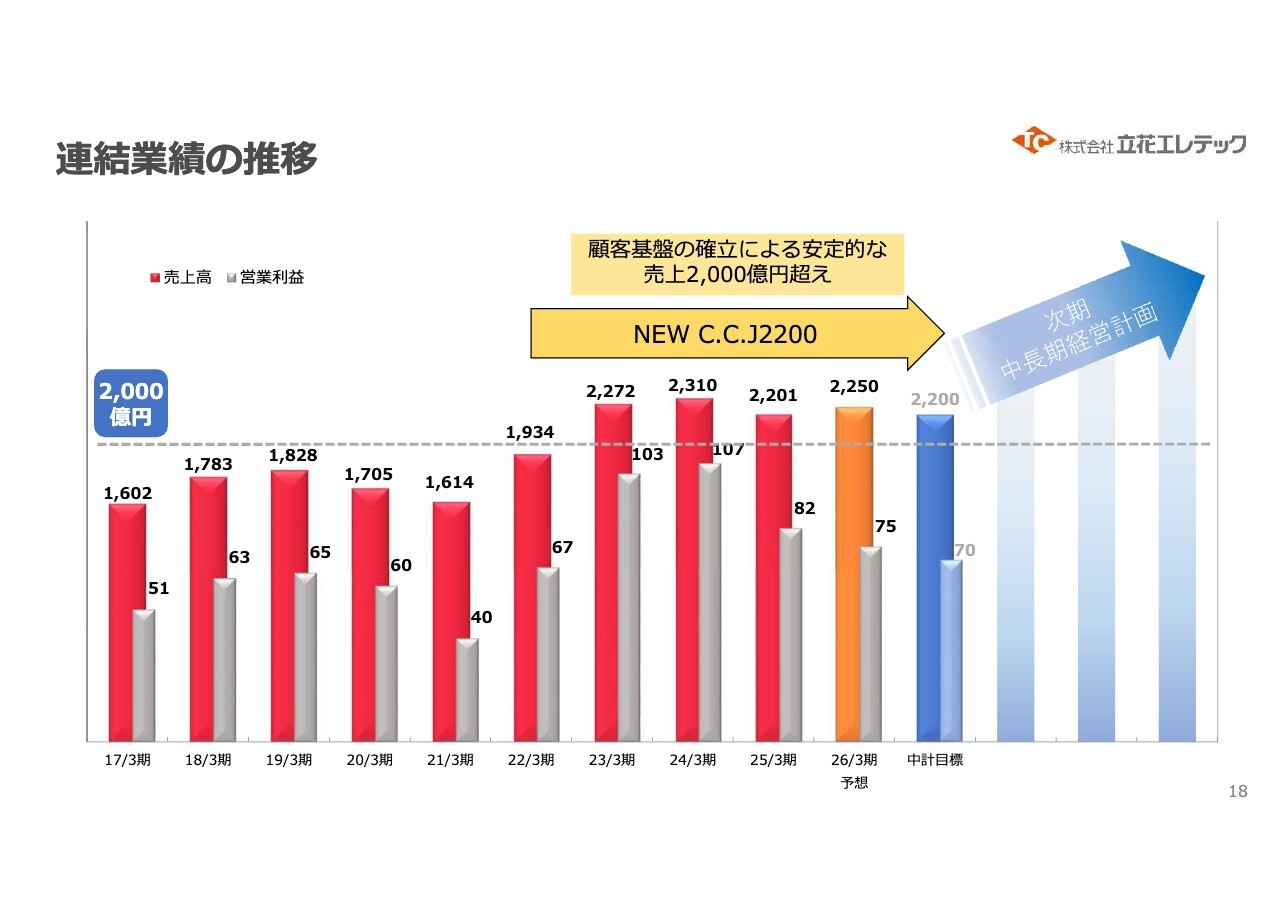 連結業績の推移についてお伝えします。当初の中長期経営計画「NEW C.C.J2200」では、売上高目標を2,200億円としていましたが、今回公表の最終年度の売上高予想は2,250億円と上回っています。その時点での営業利益は70億円を計画していましたが、現状の計画公表値では75億円となっています。
