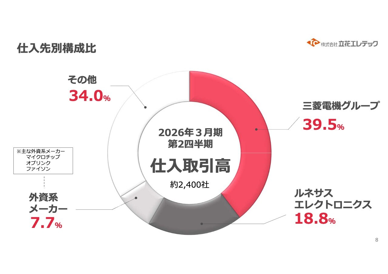 主要な仕入先構成についてです。当社は三菱電機の代理店であり、三菱電機およびそのグループ会社が約40パーセント、半導体のメインサプライヤーであるルネサスエレクトロニクスが約20パーセントを占めています。