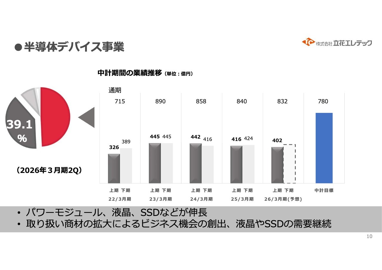 半導体デバイス事業の業績推移です。売上高は当社全体の40パーセント弱を占めています。中長期経営計画での目標は780億円でしたが、2026年3月期の予想は832億円に置いております。