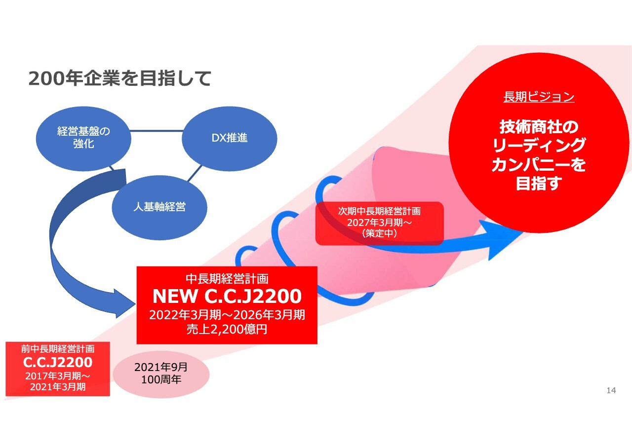 「NEW C.C.J2200」の初年度にあたる2022年3月期の売上高は1,934億円でした。この5年間でいろいろと出たり入ったりしましたが、さまざまなかたちで我々が培ってきた技術がシステムソリューションとマッチングしてきたと考えています。次の時代に合わせた5ヶ年計画の策定についても現在進行中です。