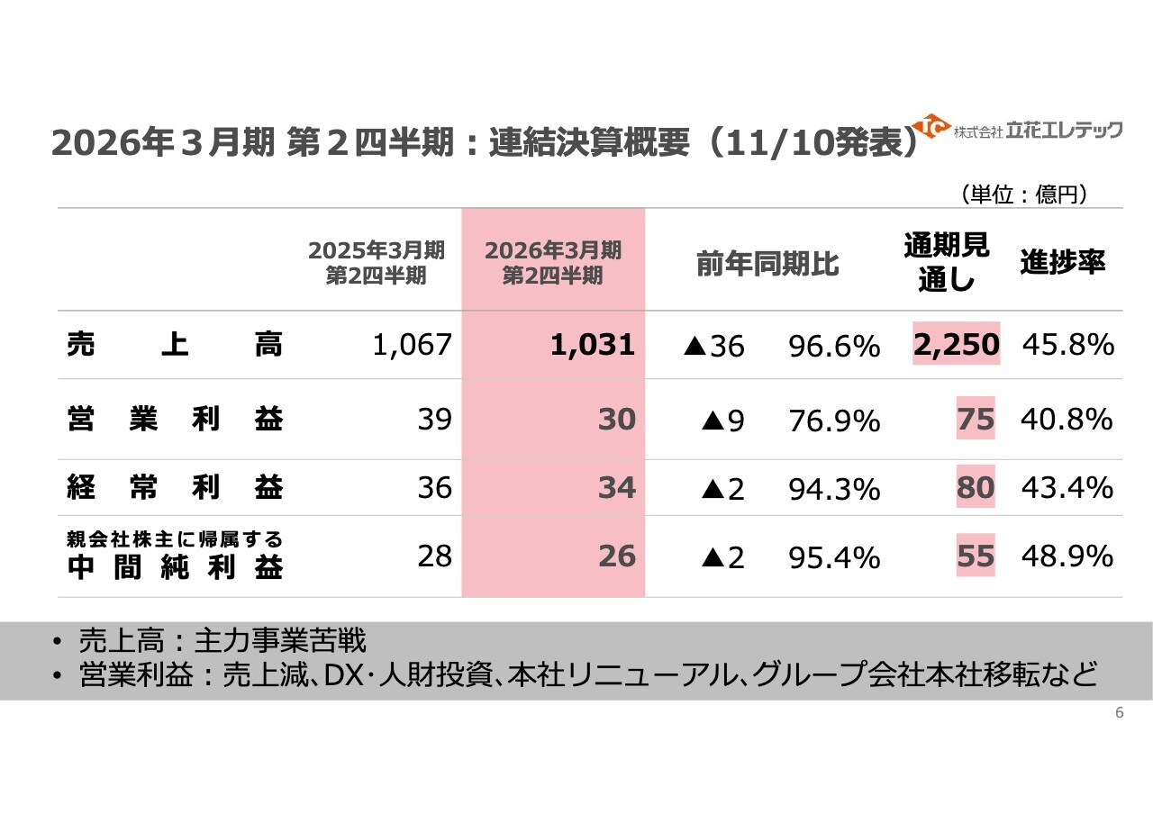布山尚伸氏(以下、布山):株式会社立花エレテック代表取締役社長の布山です。どうぞよろしくお願いします。それでは、2026年3月期第2四半期の決算についてご説明します。