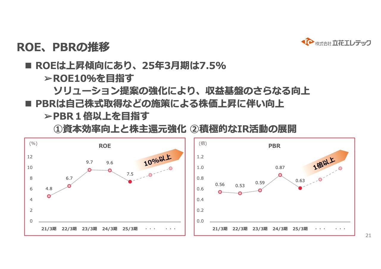 PBRについては1倍以上を目指しています。一時は0.9倍を超えそうな状況もありましたが、業績の低下や株価との対比を踏まえつつ、PBR1倍という指標に向けた戦略の検討を進めています。