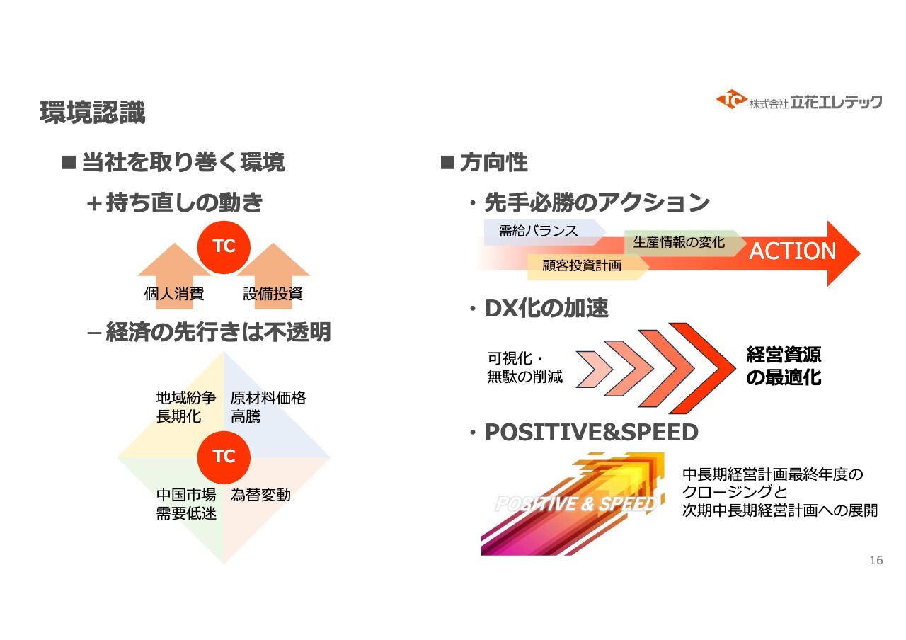 環境認識についてです。国内市場では、個人消費や設備投資、再開発などが持ち直すと見込まれますが、そのピークを見定める必要があります。また、為替の変動次第では、工場などの国内回帰の可能性もあります。