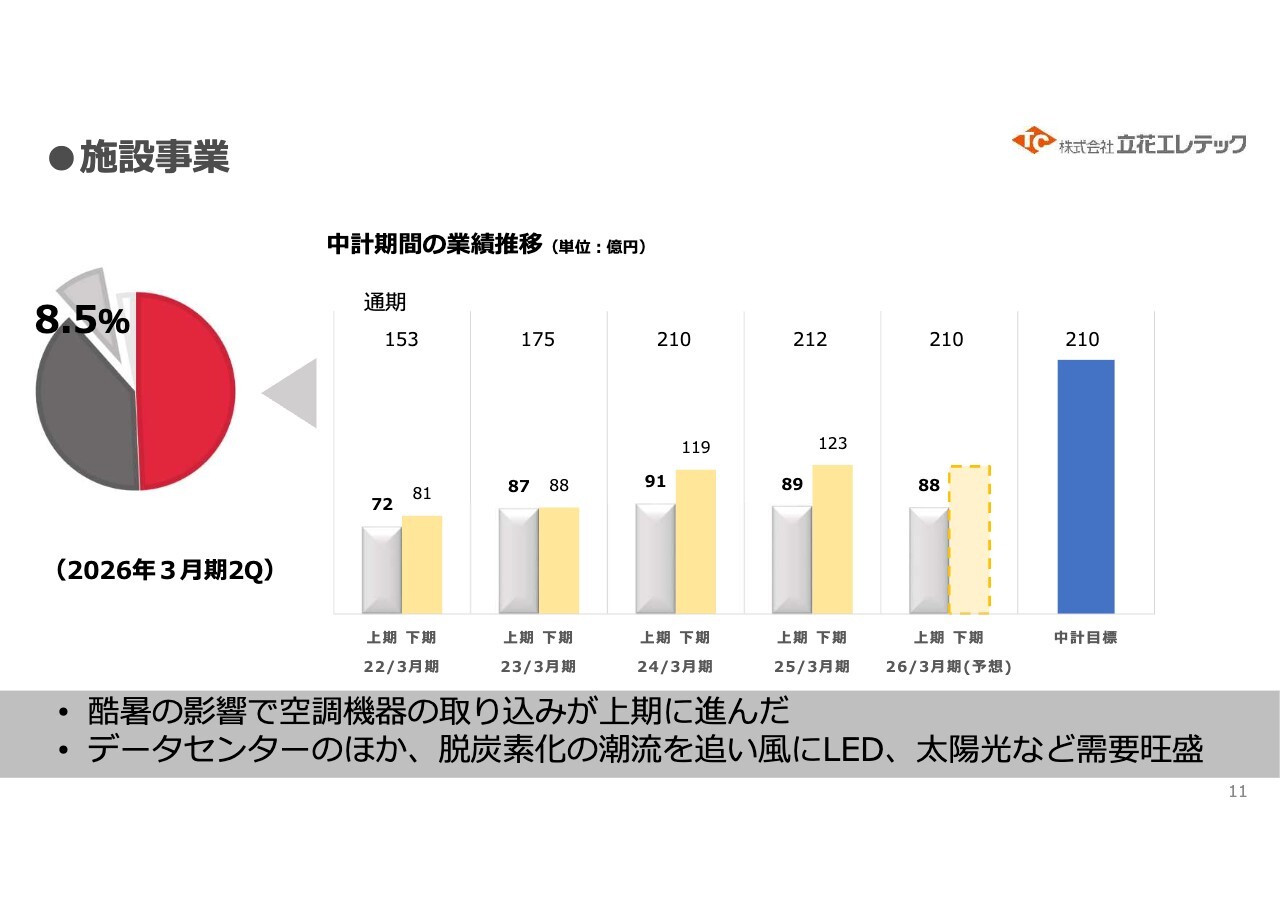 施設事業については、再開発が進むとリニューアル需要が出てきます。蛍光灯については2027年で使用が終了する予定で、これに伴いLEDへの切り替えを進めています。LED化は省エネの推進につながるものであり、こうした取り組みにしっかり対応していきます。