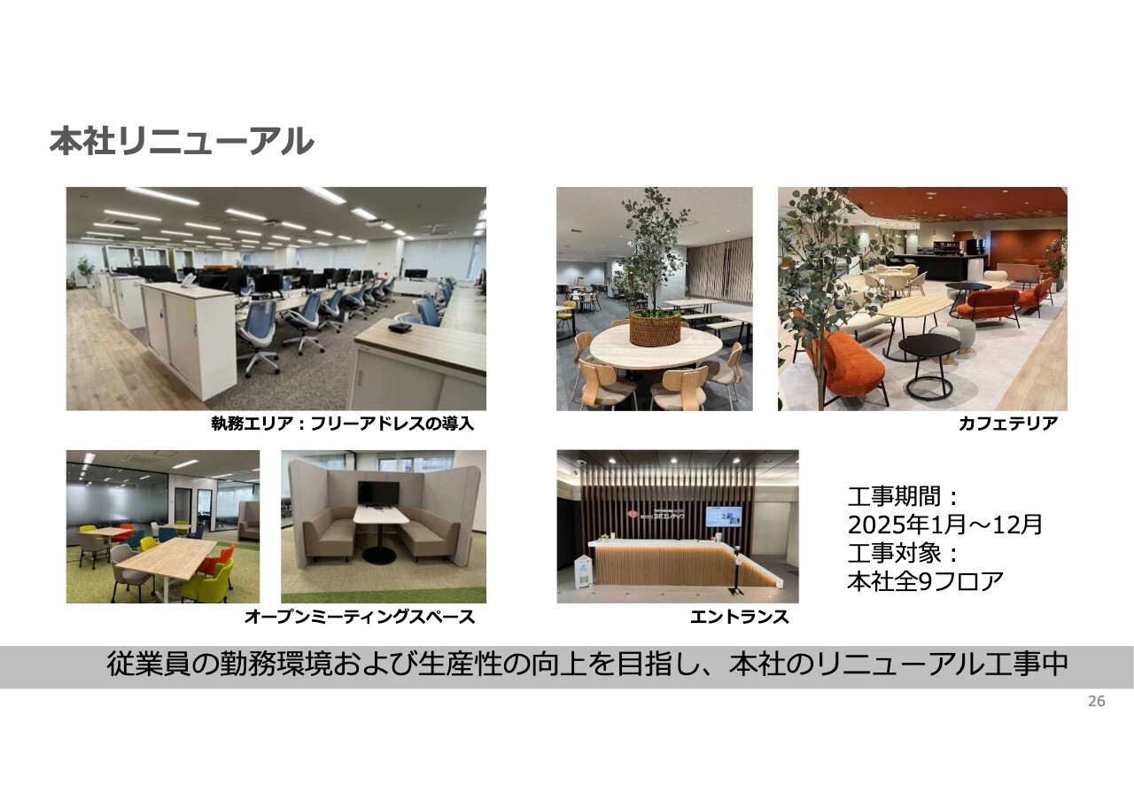 求人が難しい状況が続く中で、1月から大阪本社全フロアのリニューアルを進めています。本社は社屋建築から35年が経過していますが、社内をきれいにすることで社員の気持ちも新たに、モチベーションが少しでも向上することを期待しています。このリニューアル作業は年内に完了する予定です。