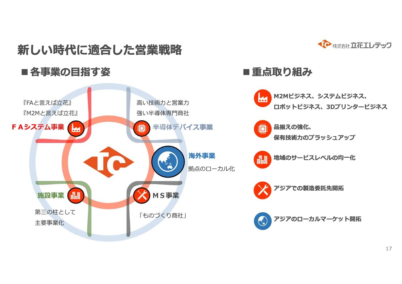各事業が目指す方向性として、「FAと言えば立花」という業界内でのポジションを強固なものとし、M2MやFAシステムの国内における高い位置づけに満足することなく、さらなるグローバル成長の基盤を確立します。
