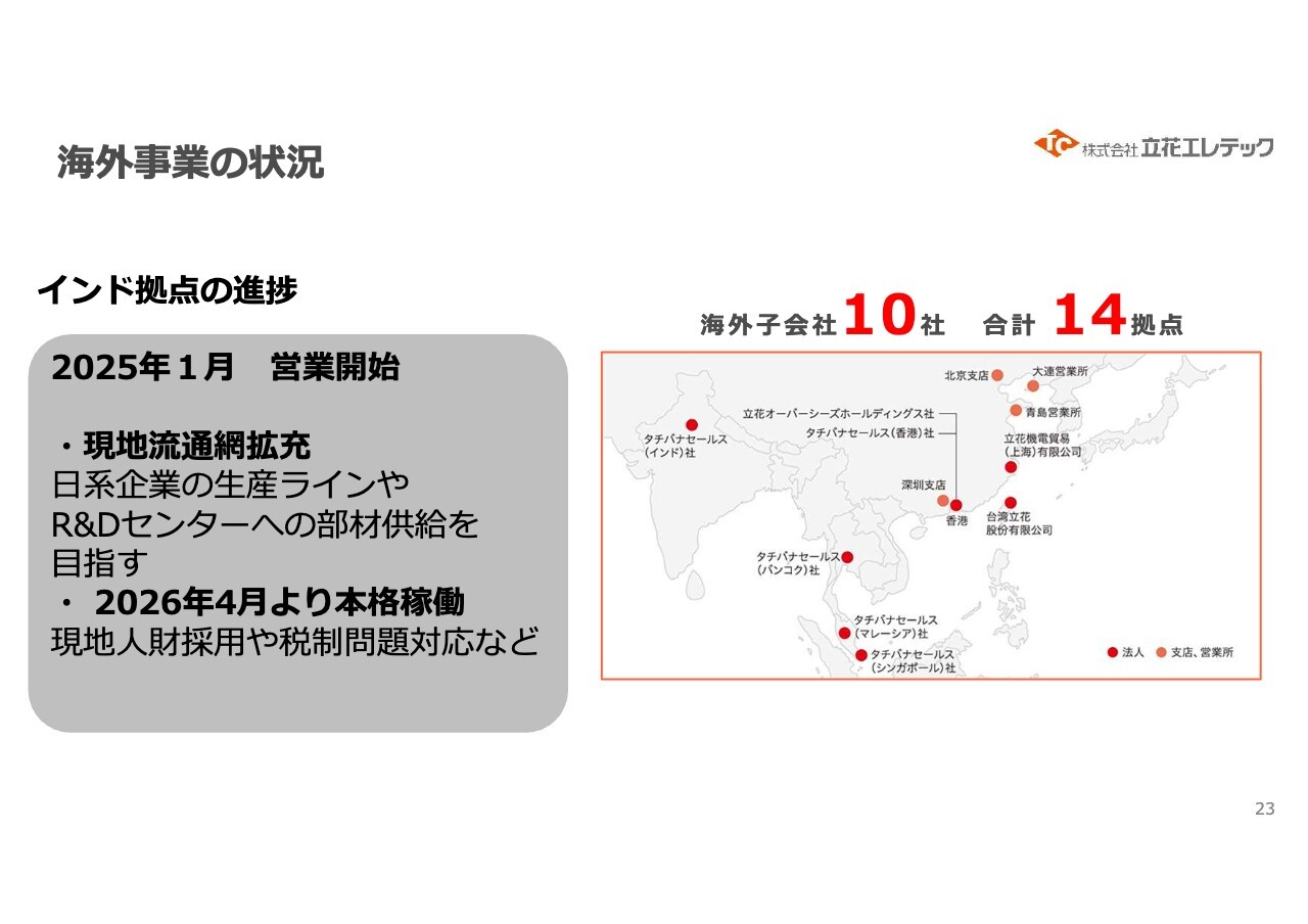 簡単にトピックスをご説明します。まずは海外事業についてです。みなさまもご存じのとおり、アジアで残された最後のマーケットの1つであり、特に最近非常に注目されている市場であるインドにおいて、2025年1月に営業を開始しました。