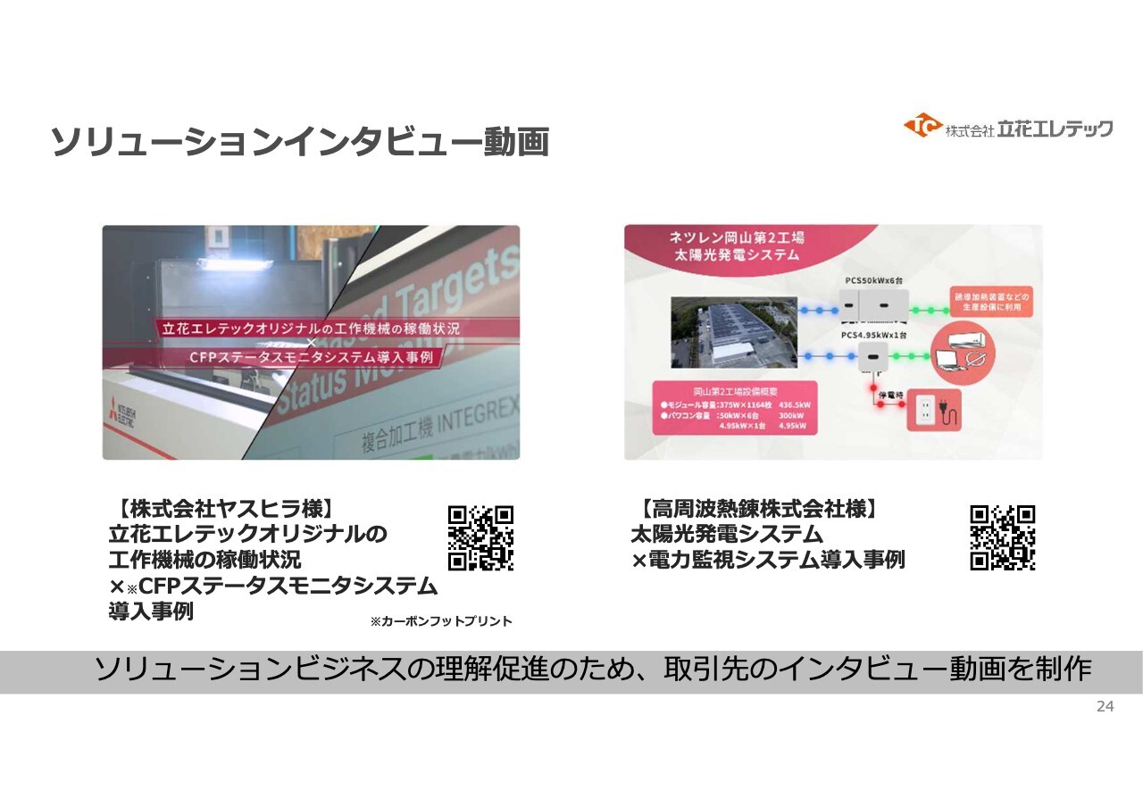 ソリューションインタビューについては、スライドのQRコードからご確認いただければ、当社が納入した工作機械の稼働状況を見ることができます。高周波熱錬さまの工場に太陽光発電システムを導入した事例もありますので、お時間のある時に取り組み内容をご覧いただければと思います。