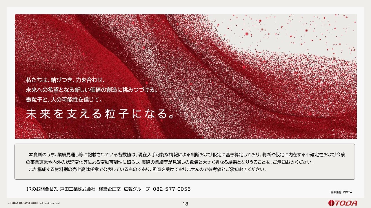 磁石材料は「成長」カテゴリーに位置づける中での売上高減少ということで、今年度は厳しい状況ではあります。しかしながら、お客さまのニーズにお応えするため、「Vision2026」の事業戦略でもお伝えしたとおり、グループ会社としてのシナジーを最大化する取り組みや、事業領域を広げる取り組みを国内外で連携しながら、将来を見据えた活動を継続しています。