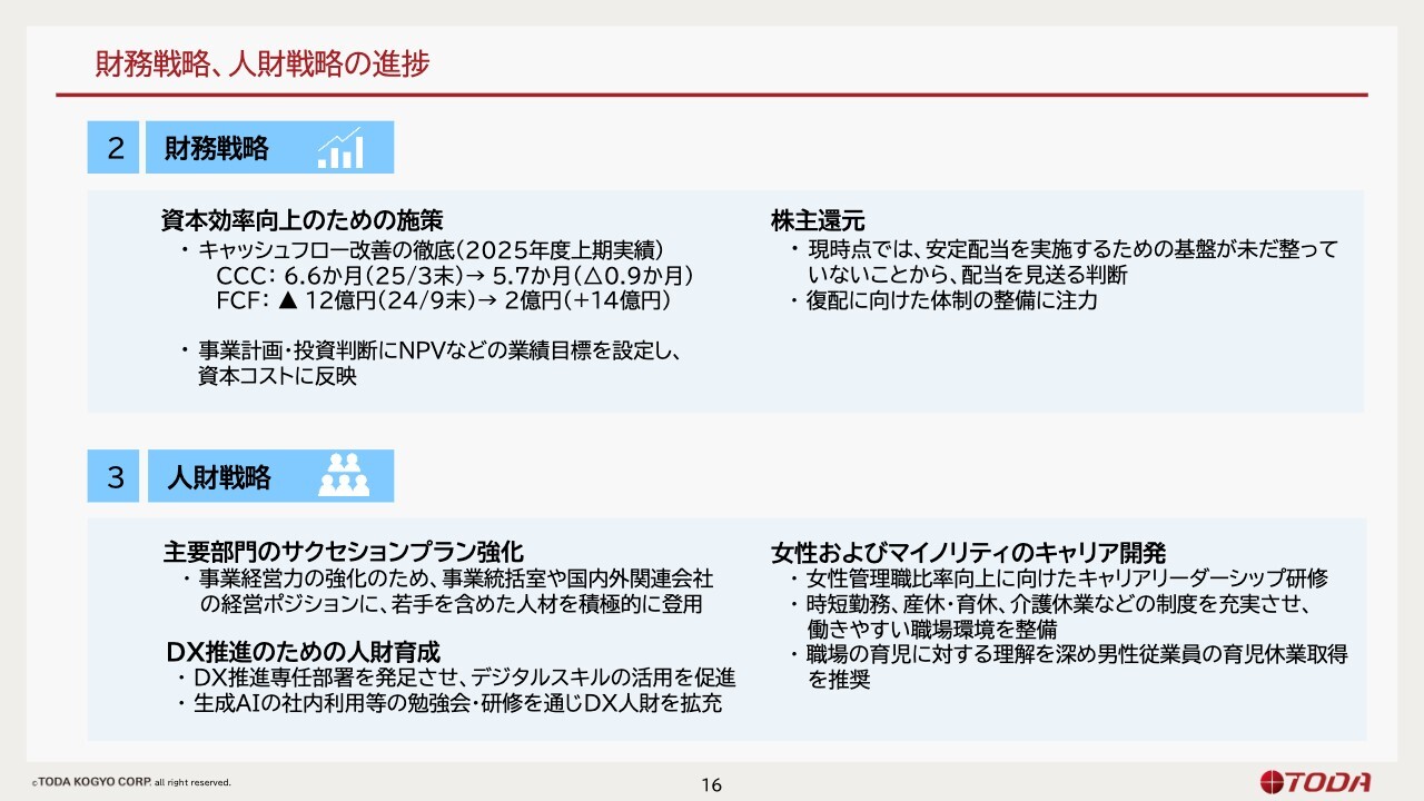 財務戦略については、資本効率の向上を目指し、さまざまな取り組みを進めてきました。キャッシュフロー改善に注力しており、その取り組みの成果が出てきています。具体的には、CCC(キャッシュ・コンバージョン・サイクル)について、2025年3月末時点で6.6ヶ月と非常に長かったところを、今年度は改善に注力してきました。その結果、現時点で上期の進捗として5.7ヶ月と短縮され、一定の効果が出ています。