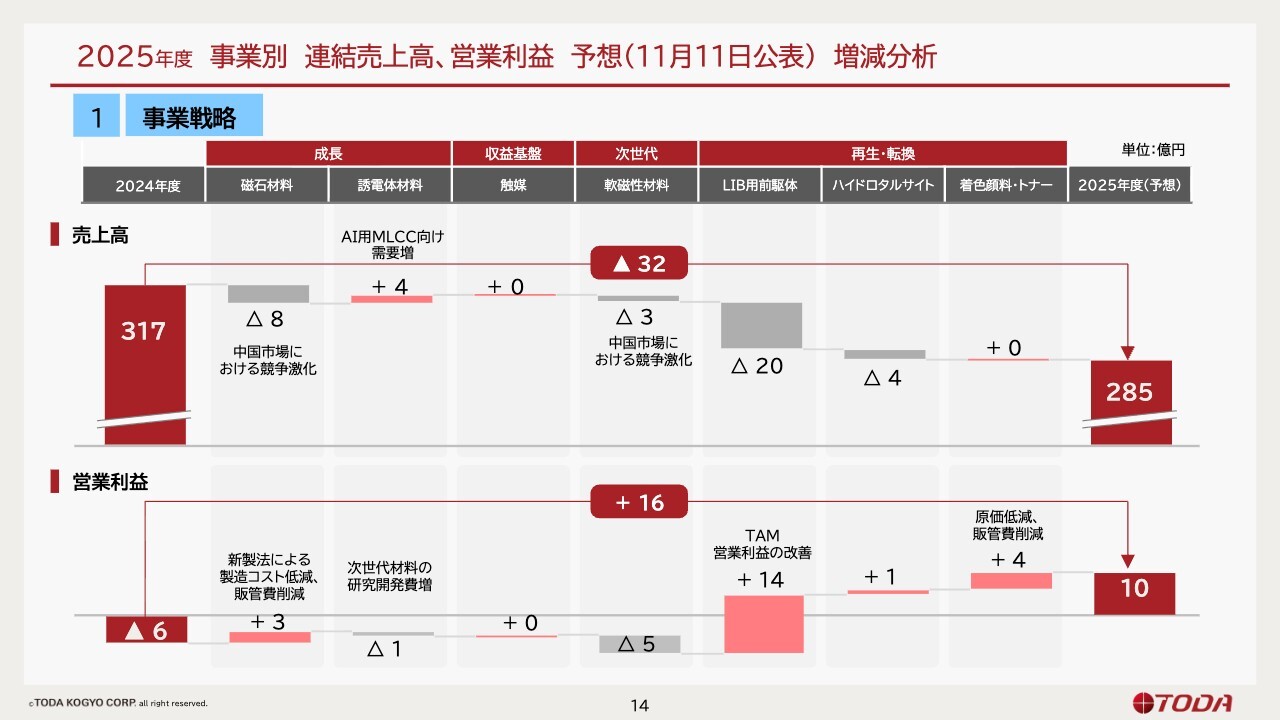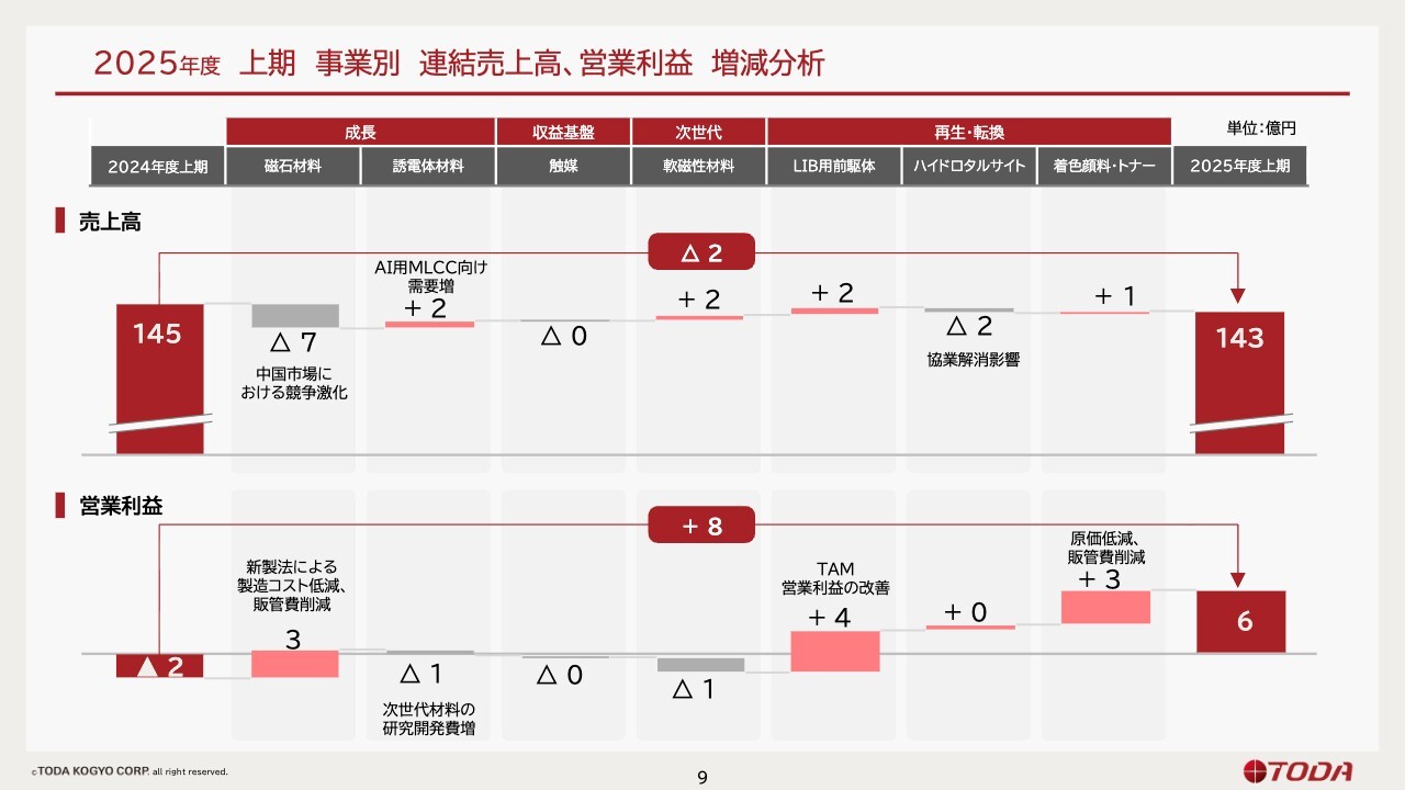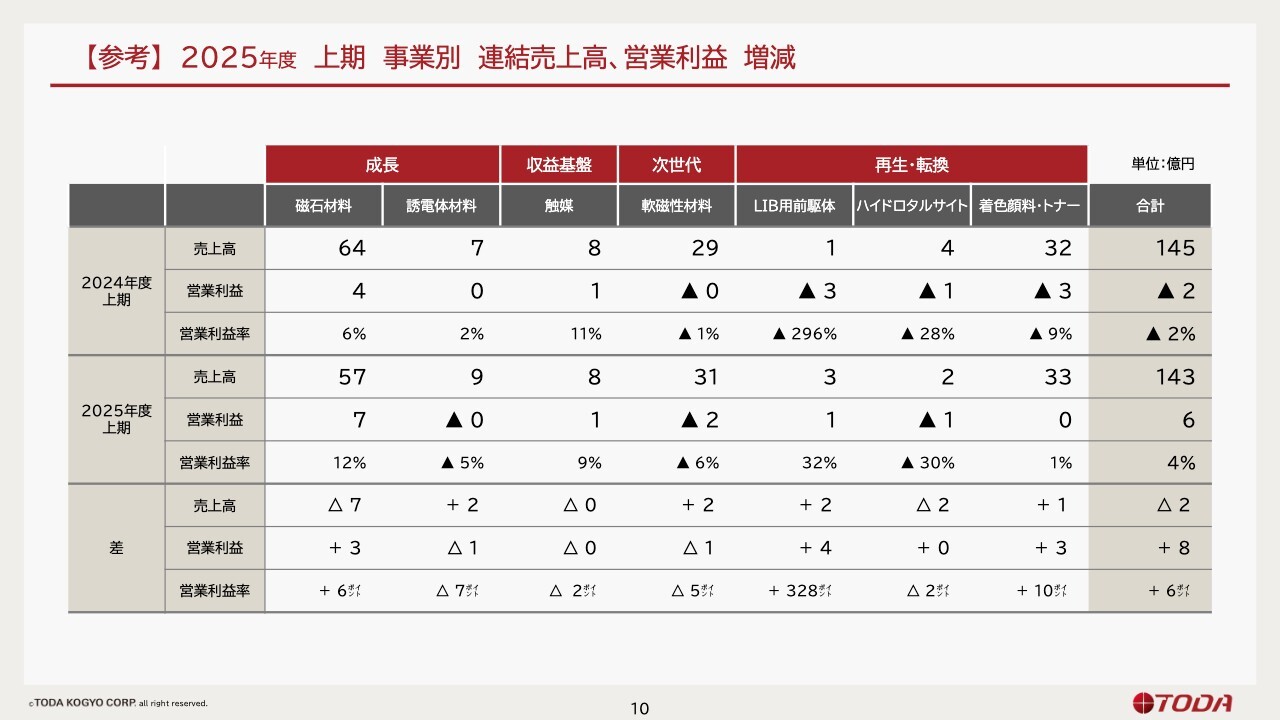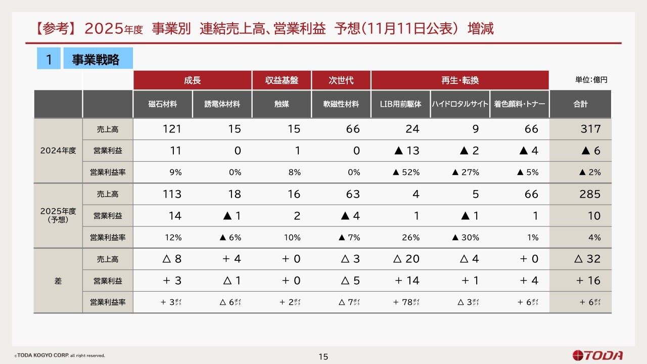 「成長」カテゴリーに位置づけている磁石材料については、上期の状況を引き継ぎ、下期も減収の推移が続くと認識しています。一方、営業利益の観点では、原価管理や低減、新製法の取り組みが実績として少しずつ数字にも表れてきており、今年度の通期営業利益に寄与する見込みです。