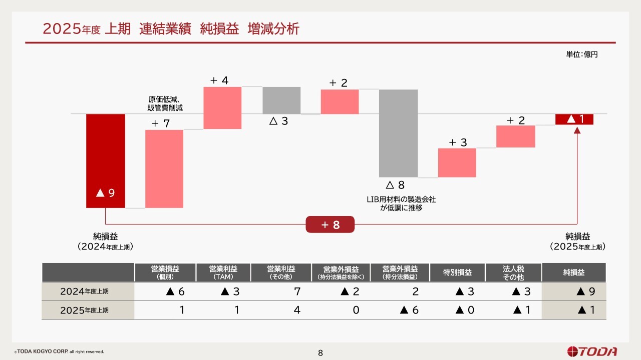 営業利益は前年同期比で9億円増益の6億円となりました。この営業利益については、原価低減および販管費削減に着実に取り組んだ成果といえます。また、昨年度カナダの事業会社である戸田アドバンストマテリアルズInc.(TAM)の解散・清算を決議したことで、TAMの収益が改善した面もあり、営業利益は増益となりました。