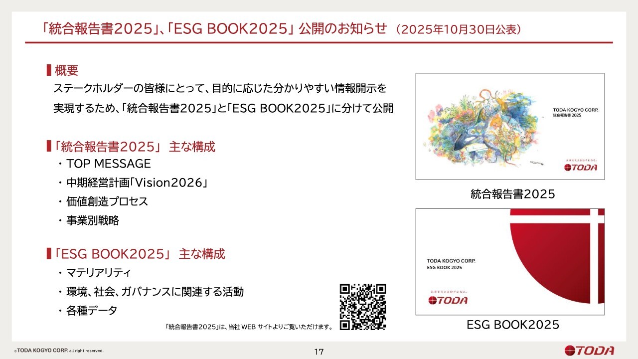 最後に、10月30日にWeb上で公開した2回目の統合報告書についてお知らせします。今回は、「統合報告書2025」と各種データを主体とした「ESG BOOK2025」の2部構成に分けて作成しました。