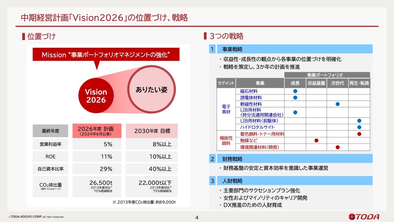 まずは「Vision2026」の戦略概要についてご説明します。2030年度における戸田工業として「ありたい姿」を設定しました。