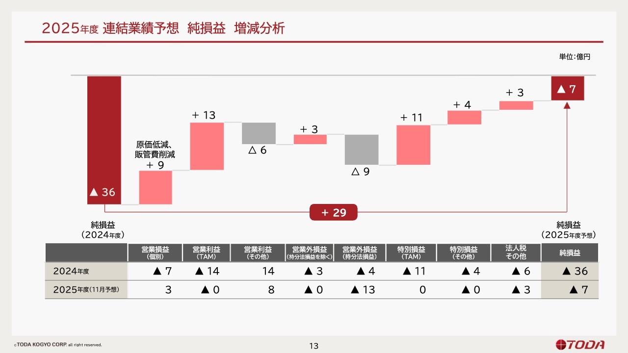 営業利益・経常利益・純利益などの利益面については、2024年度にはTAMの整理や引当などが影響し、大きく落ち込んだ要素がありました。しかし、2025年度にはそれら要素がなくなることから連結業績予想における各収益段階では改善を見込んでいます。