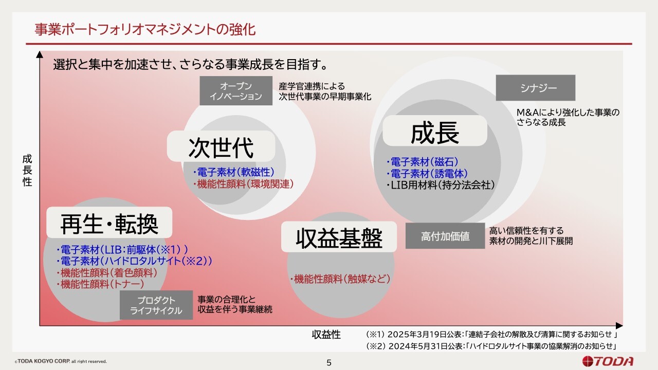 各事業の概要、取り組みに関してご説明します。まず、スライド右上に記載されている「成長」カテゴリーについてです。国内外の戸田工業グループ各社が持つ強みを活かし、シナジーを最大化することを1つの柱としています。また、現在当社が展開する素材事業の領域から、さらに領域を拡大することを目指します。この2つを大きなコンセプトとし、磁石材料事業や誘電体材料事業の成長に取り組んでいます。