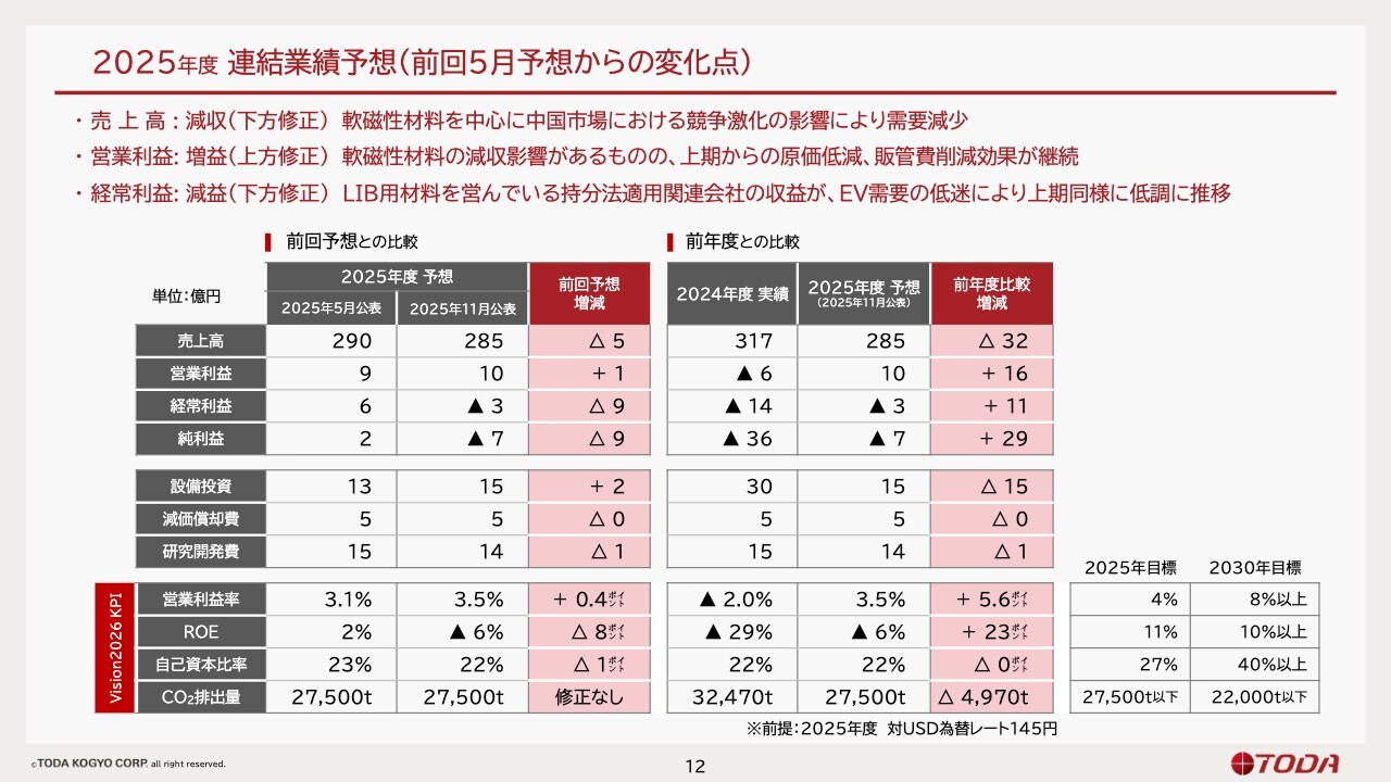 スライド左側の表は5月公表と11月公表の変化点を記載しています。売上高は11月公表で285億円となり、前回予想から5億円の減収となっています。上期の結果を下期も引き継いだ流れがあり、特に軟磁性材料の販売が押し下げ要素として大きく影響しています。