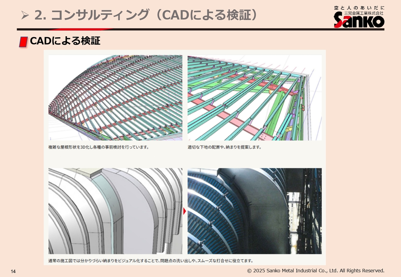 CADによる検証事例として、複雑な屋根形状を3D化した各種の事前検討、適切な下地の配置や納まりの提案、通常の施工図では分かりづらい納まりをビジュアル化することで、問題点の洗い出しや、スムーズな打ち合わせに役立てることなどが挙げられます。