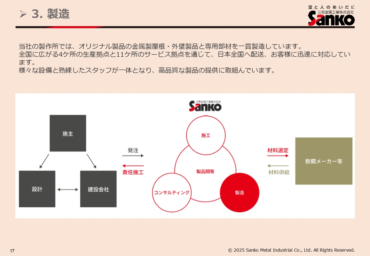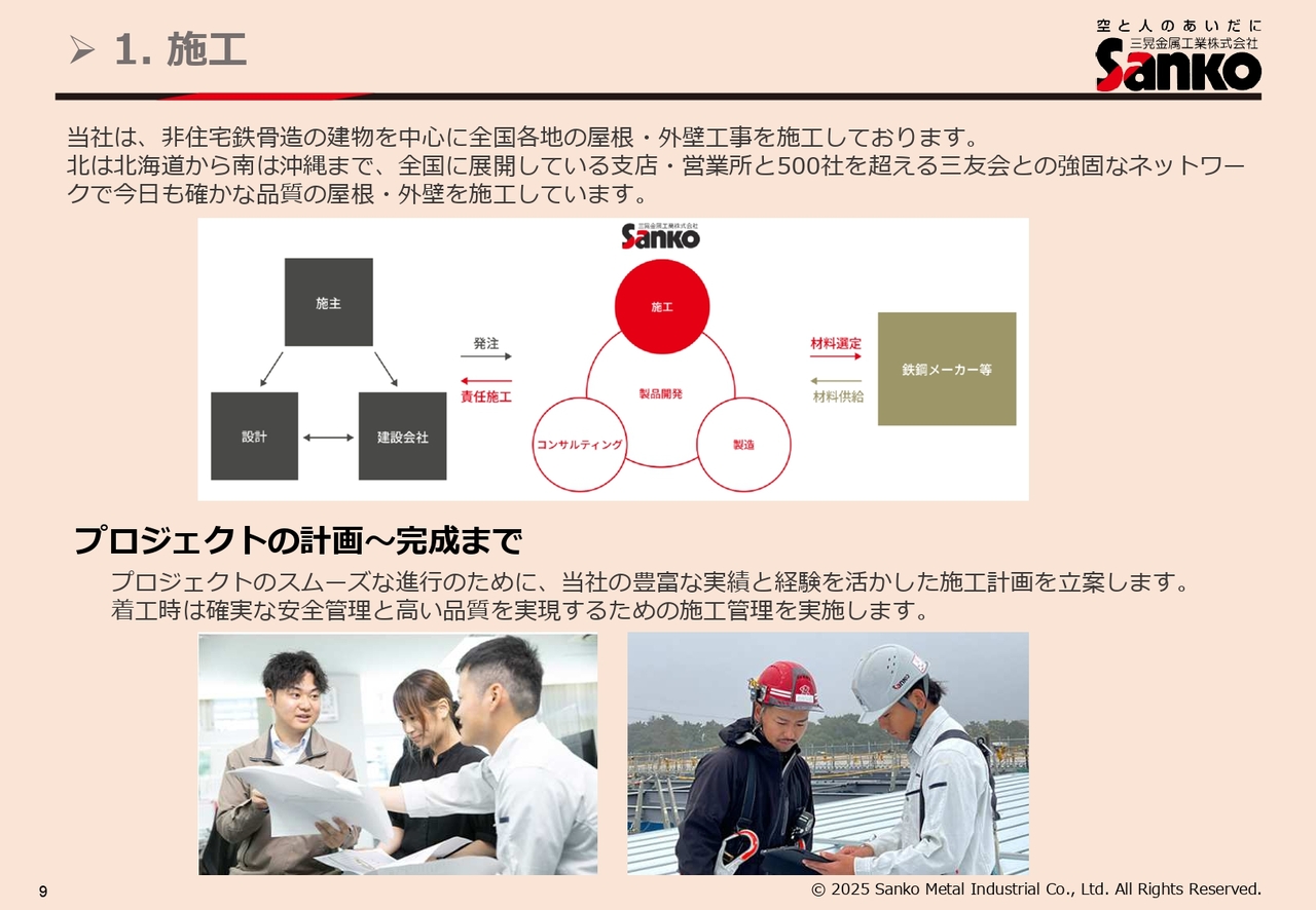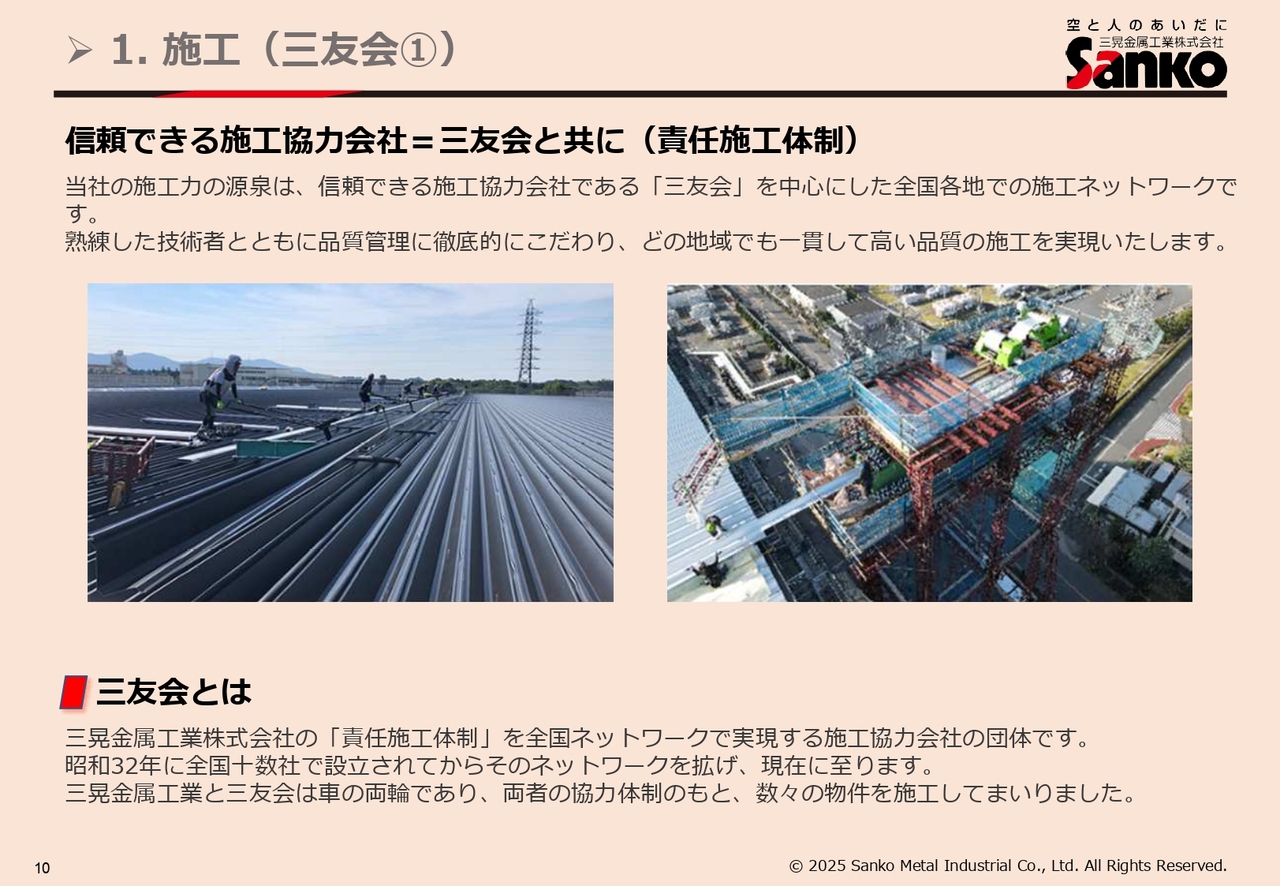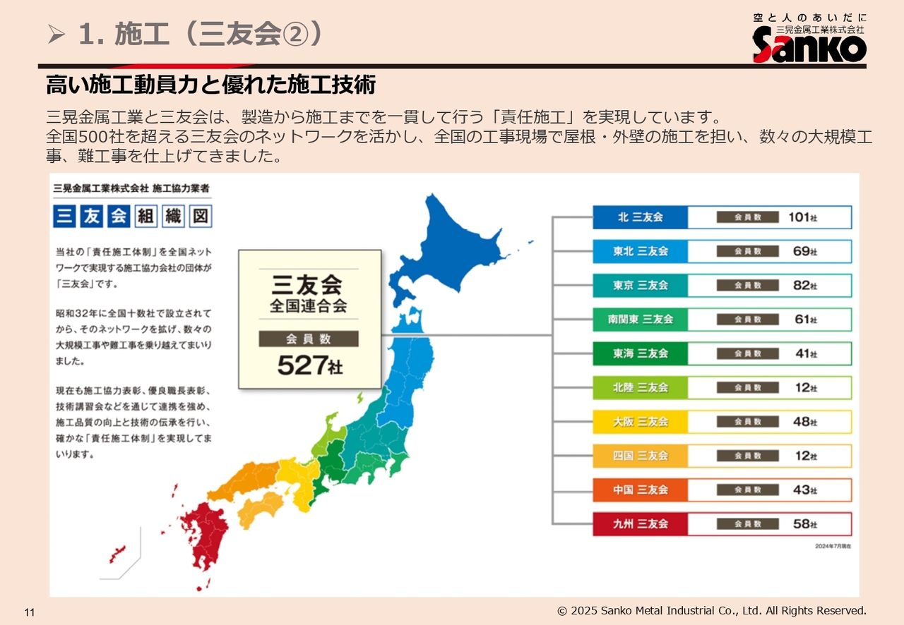 全国に50ヵ所の事業所と500社を超える施工協力会社「三友会」のネットワークを活かし、自社製品の製造・設計から施工まで一貫した「責任施工」体制を実現しています。