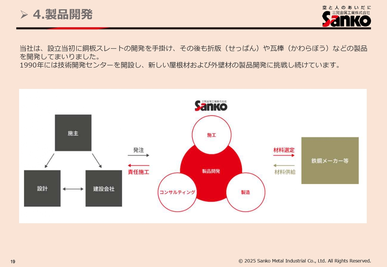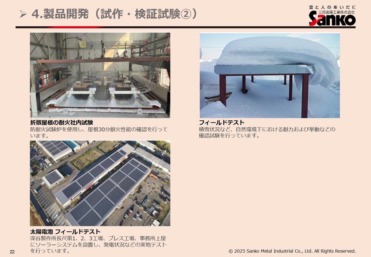 こうした取り組みは、自社に実証実験を行う技術開発部門を有し、屋根を構成する専用部材まで一貫して設計・製造をしている三晃金属工業ならではの強みです。また、プレハブハウスメーカー向けの屋根材・金属加工部材の製造も手掛けており、建てやすさ、住みやすさに貢献しています。