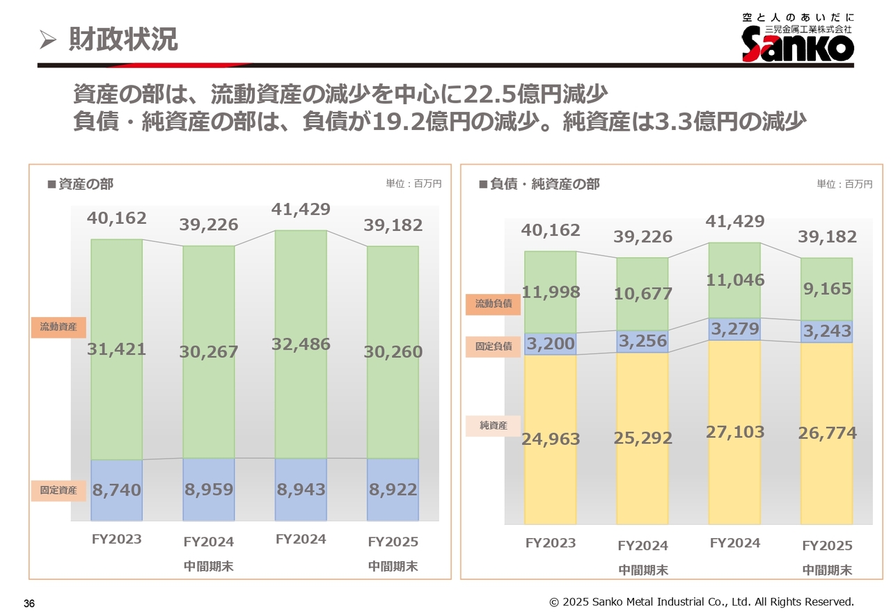 総資産については、流動資産の減少を中心に22.5億円減少し、391億円となりました。