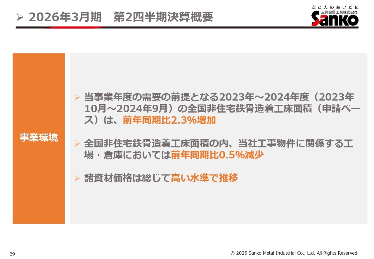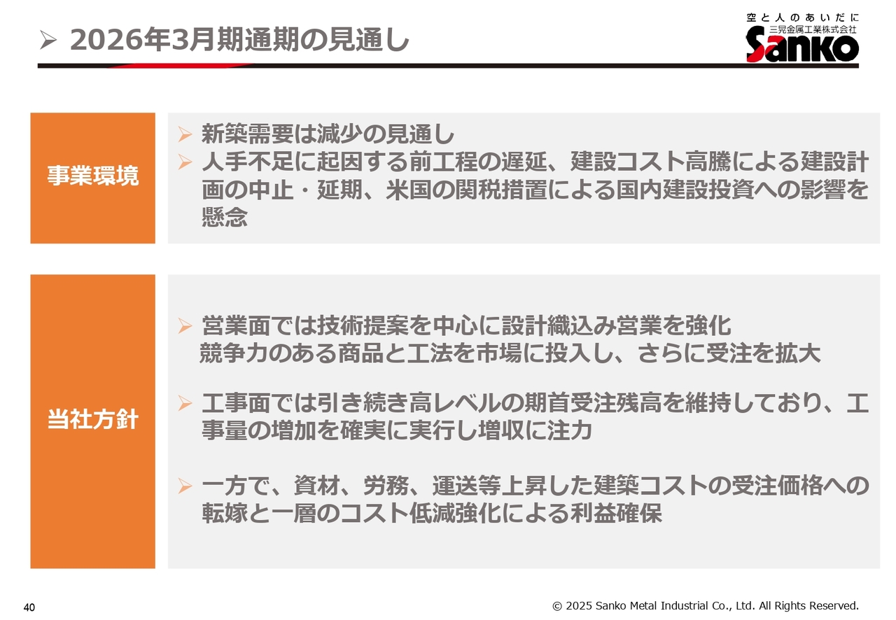 建設業界においては、新築需要の減少、人手不足等に起因する前工程の遅延、建設コスト高騰による建設計画の中止・延期などが引き続き懸念される中、米国の関税措置による国内建築投資への影響などを含めて今後の動向を注視していきます。