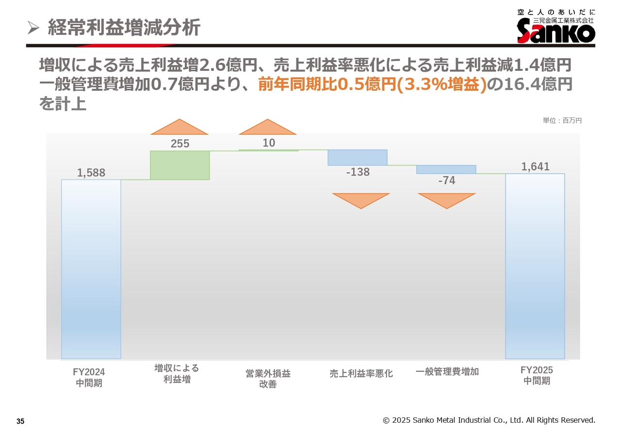 経常利益については、増収による売上利益増2.6億円、売上利益率悪化による売上利益減1.4億円、販売費及び一般管理費増加0.7億円により、前年同期比0.5億円(プラス3.3パーセント)増益の16.4億円となりました。