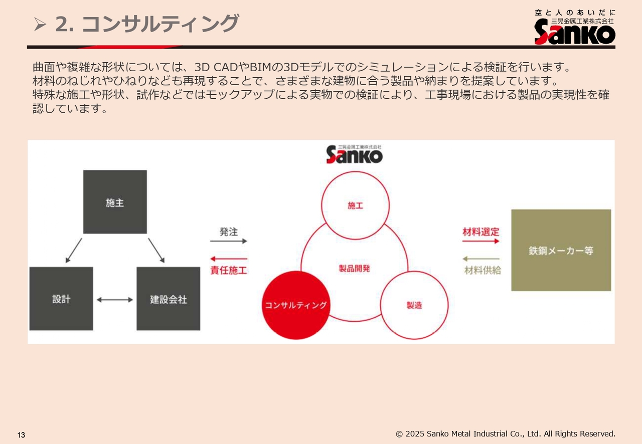デザインを実現するための意匠面の提案はもちろん、求められる性能(耐久性、耐風圧力、断熱性能、遮音性能、雨量検討、耐積雪性能など)に応えるための技術提案から、製品のCAD・BIMデータの提供、施工計画の提案といった、設計から施工までトータルソリューションを提供します。