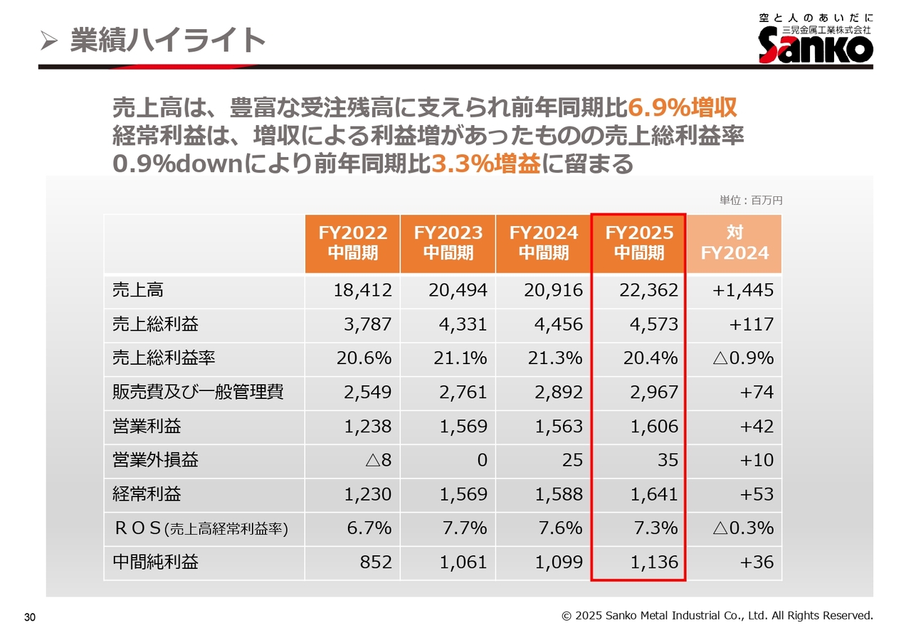 売上高は、豊富な受注残高に支えられ前年同期比6.9パーセント増収の223億円、経常利益は、増収による利益増があったものの売上総利益率0.9パーセントダウンにより前年同期比3.3パーセント増益の16億円に留まりました。