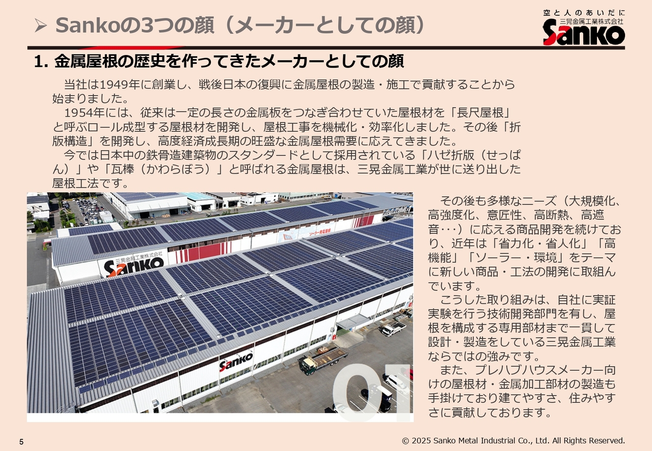 まずは、「金属屋根の歴史を作ってきたメーカーとしての顔」です。当社は1949年に創業し、戦後日本の復興に金属屋根の製造・施工で貢献することから始まりました。