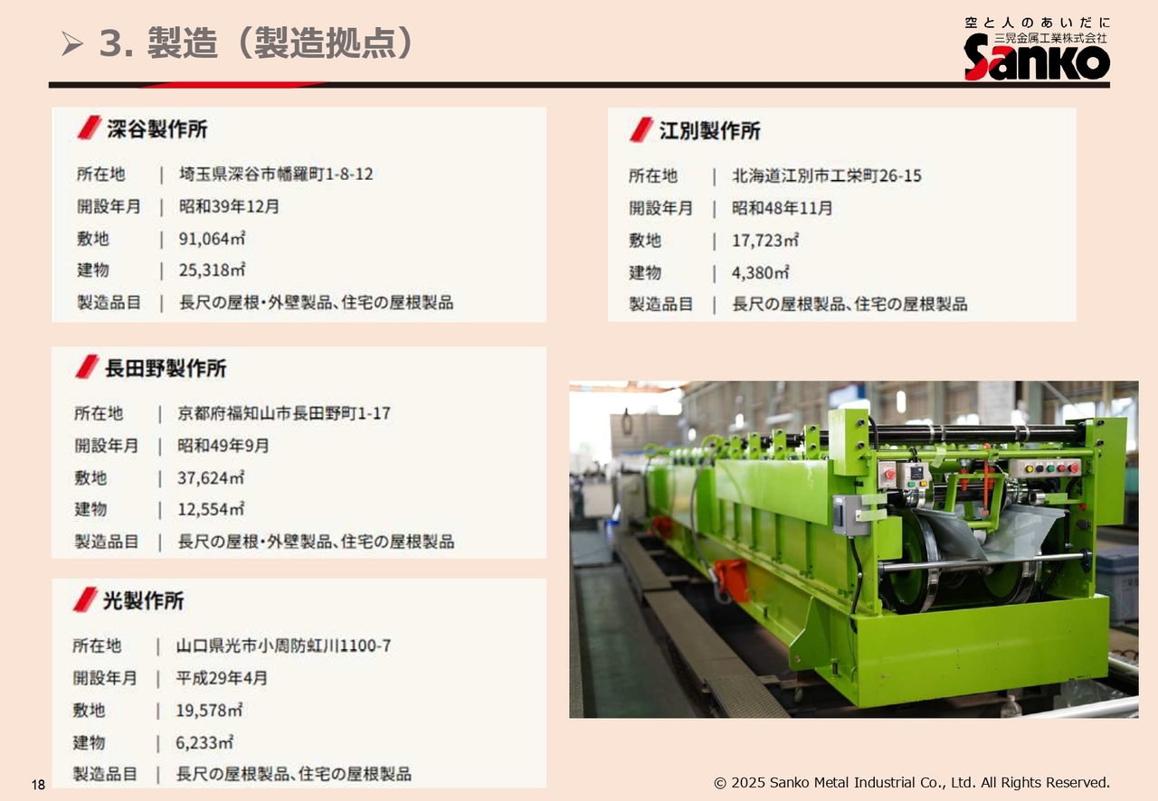 埼玉県所在の深谷製作所、京都府所在の長田野製作所、山口県所在の光製作所、北海道所在の江別製作所、以上4ヵ所に生産拠点を構えています。