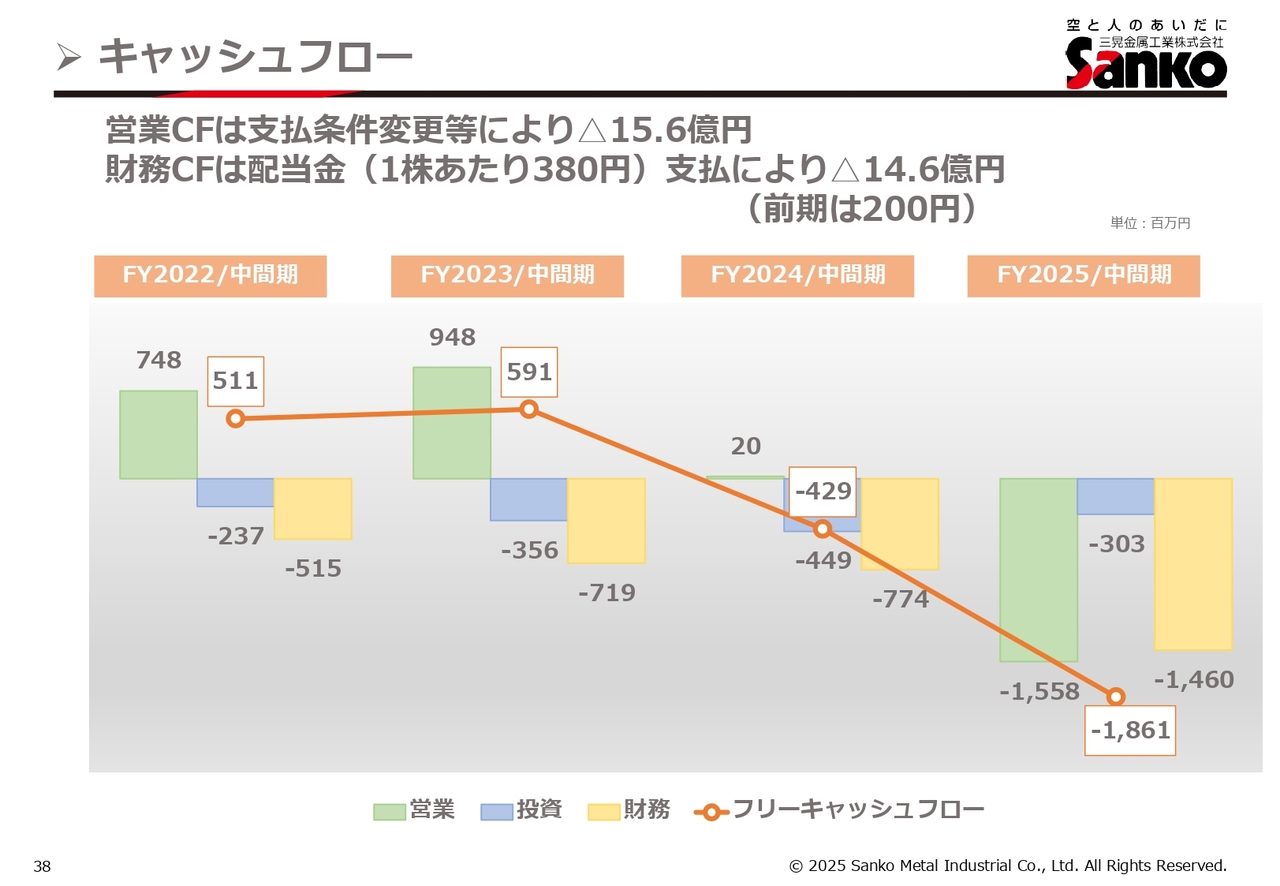 営業活動による資金の減少は、支払条件変更等により15.6億円となりました。