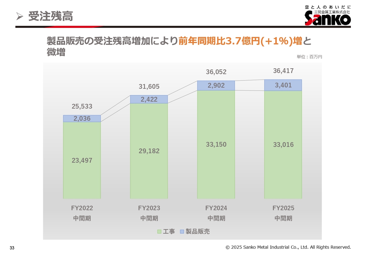 受注残高は、製品販売の受注残高増加により前年同期比1パーセント増の364億円となり、過去最高を更新しました。