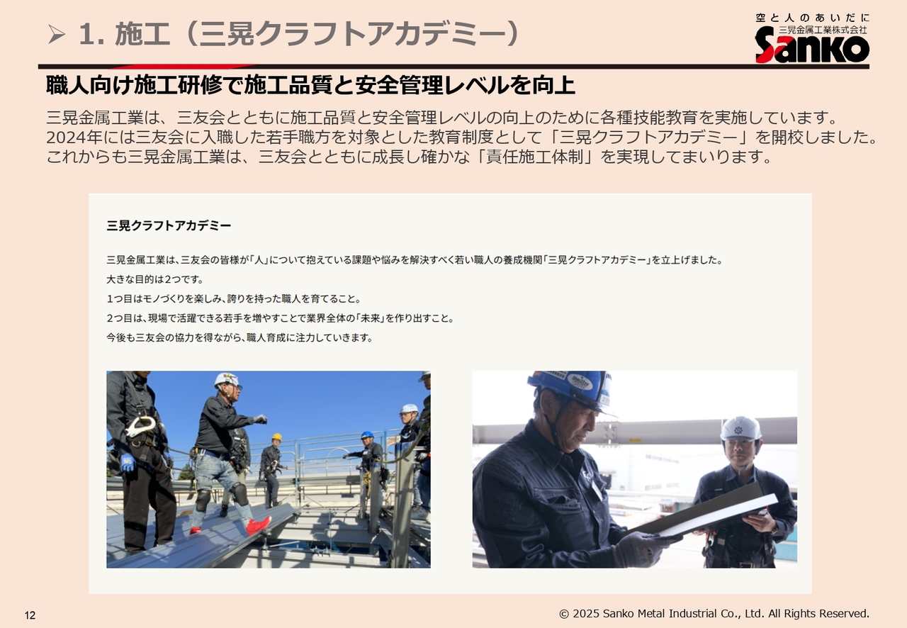 また従来の施工力向上にむけた取り組みに加え、三友会会員の施工技能向上と技術伝承、新規入職者の支援のため、埼玉県深谷市に職人養成機関「三晃クラフトアカデミー」を2024年に立ち上げ、業界の発展と施工技術の向上に取り組んでいます。