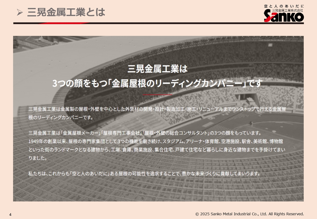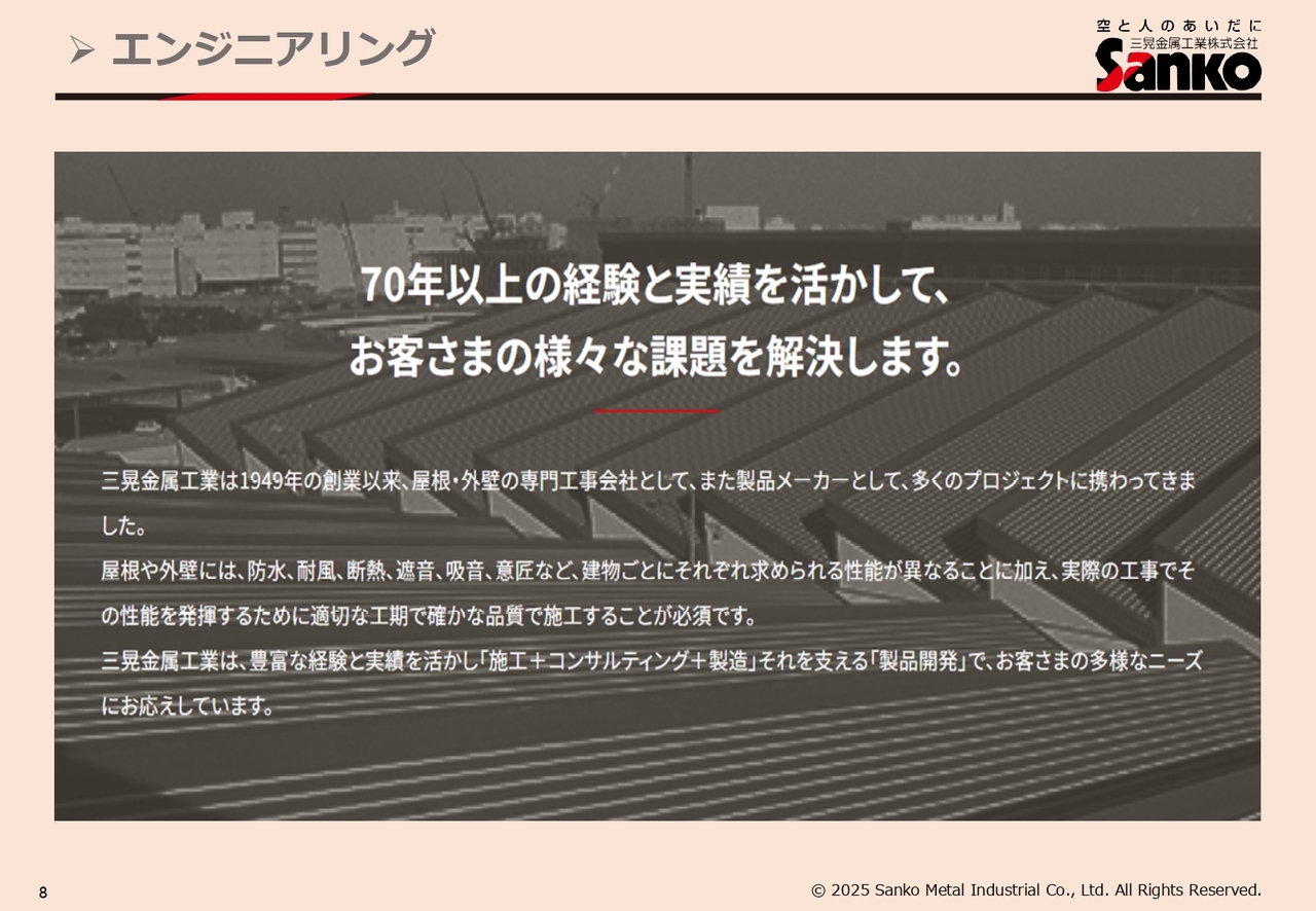 当社は金属製の屋根・外壁を中心とした外装材の開発・設計・製造加工・施工・リニューアルまでワンストップで行える金属屋根のリーディングカンパニーです。