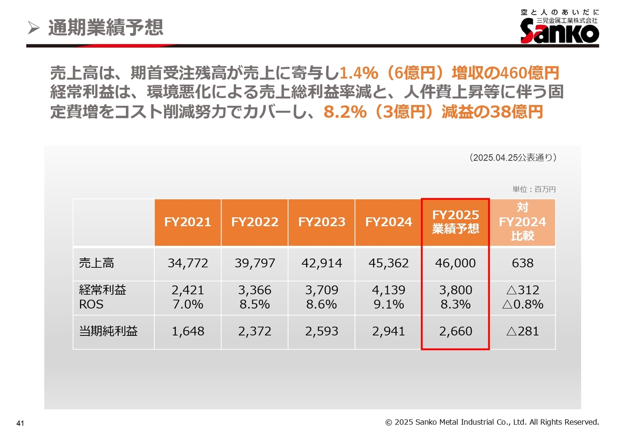 売上高は、期首受注残高の売上寄与により前期比1.4パーセント(6億円)増の460億円、経常利益は、環境悪化による売上総利益率減と、初任給の引き上げを含む給与水準の改定等に伴う労務費の増加、新規設備投資に伴う減価償却費の増加等コストの上昇をコスト削減努力でカバーし、前期比8.2パーセント(3億円)減益の38億円、当期純利益は26億円と、増収減益の見通しとしており、2025年4月25日公表からの変更はありません。