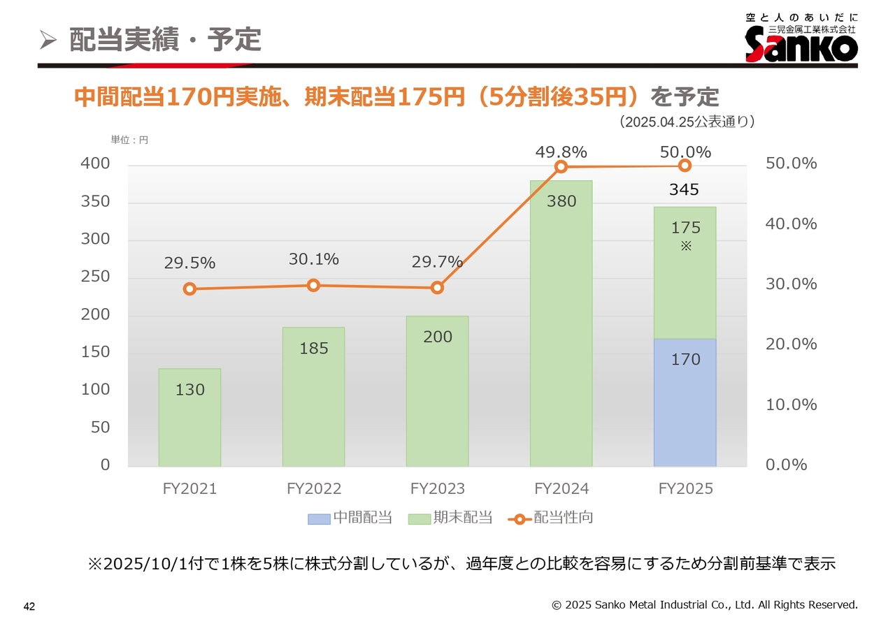 2025年度の配当金については、配当性向50パーセント方針より、株式分割前基準で345円とさせていただいており、2025年4月25日公表からの変更はありません。