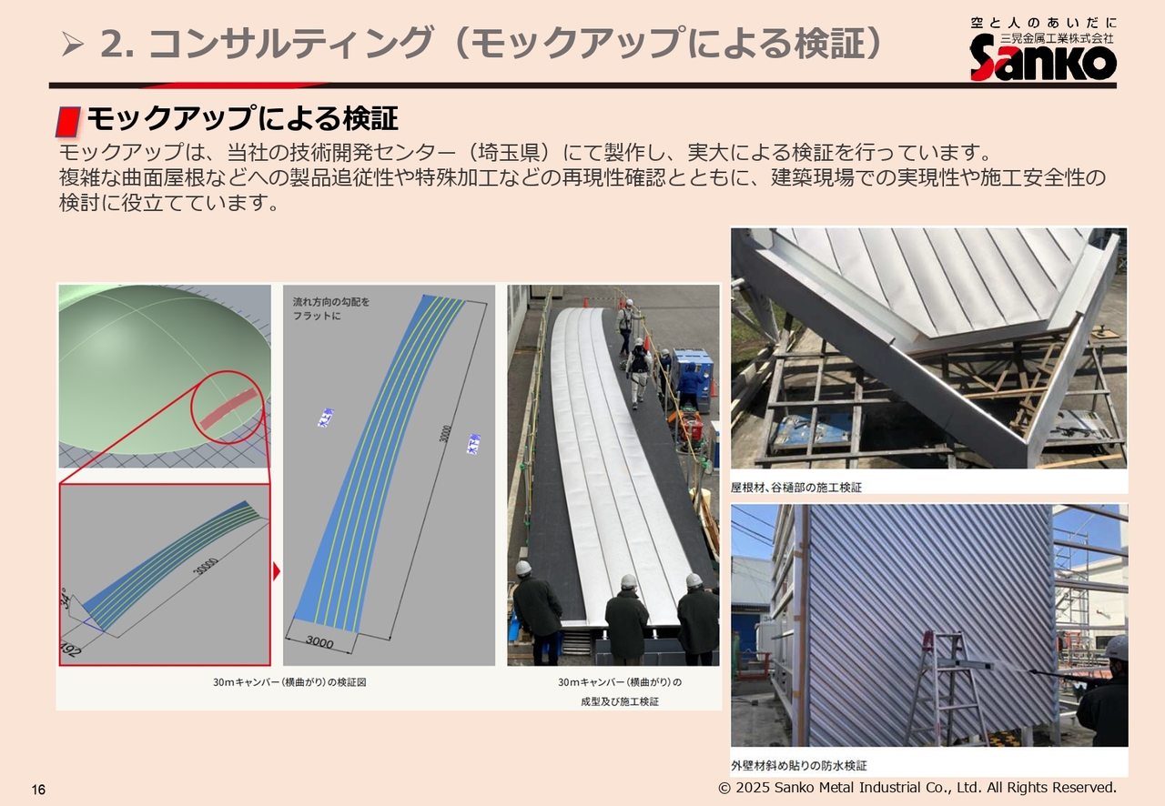 複雑な曲面屋根などへの製品追従性や特殊加工などの再現性確認とともに、建築現場での実現性や施工安全性の検討に役立てています。