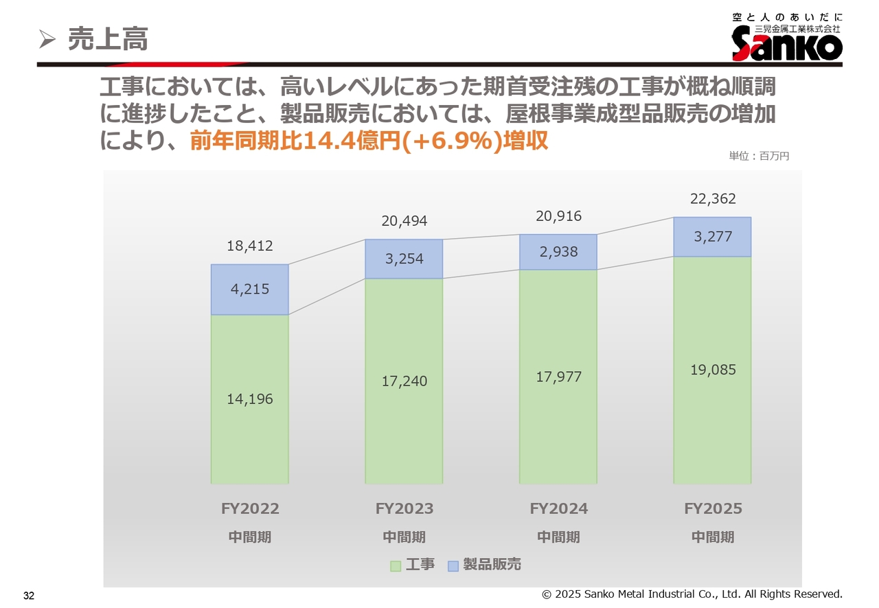 売上高については、前年同期比6.9パーセント増収の223億円となりました。うち完成工事高は、工事が比較的順調に進捗したことにより前年同期比6.2パーセント増収の190億円となり、製品売上高は、屋根事業における成型品販売の増加などに伴い前年同期比11.5パーセント増収の32億円となりました。