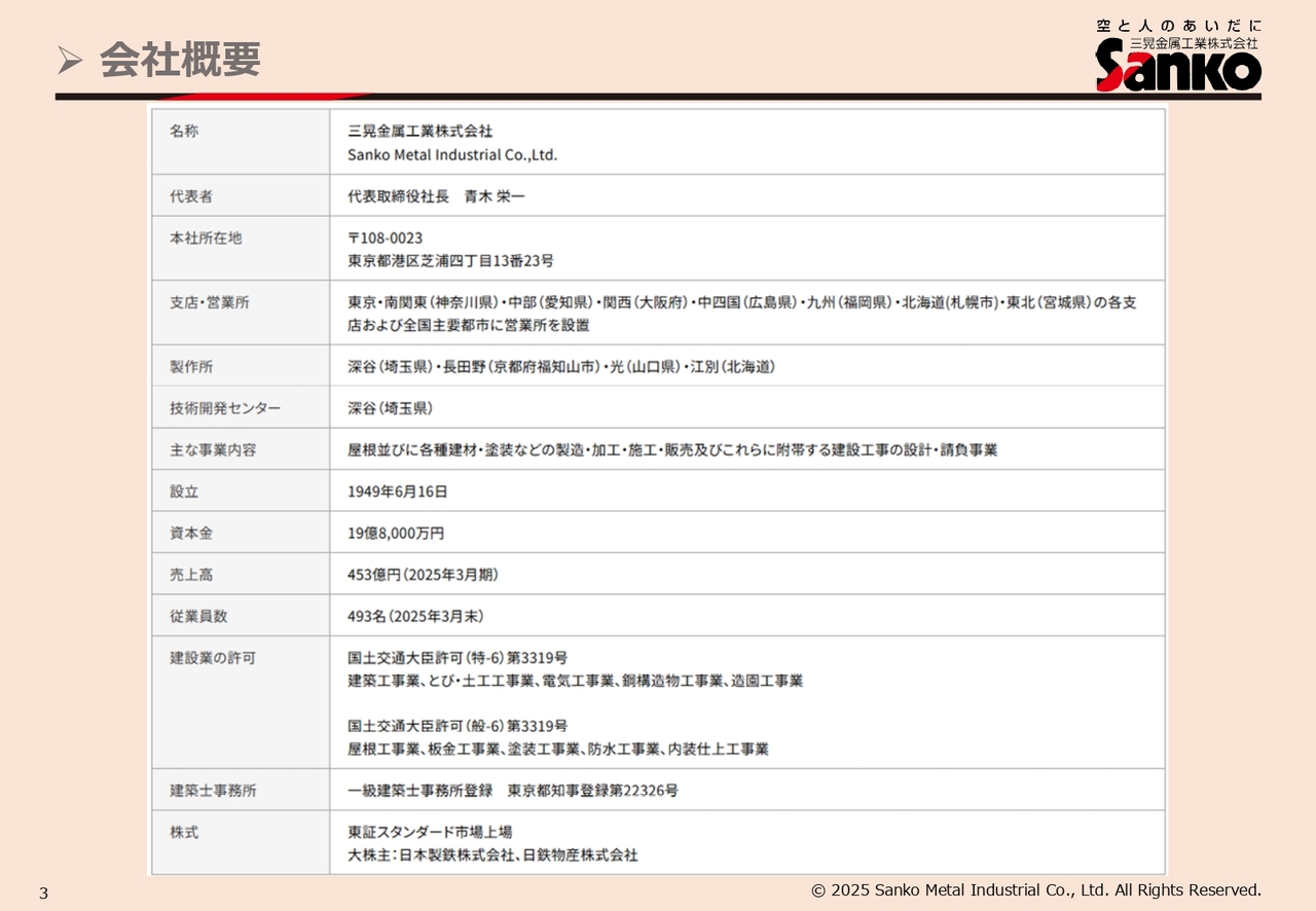 主な事業内容は、屋根並びに各種建材・塗装などの製造・加工・施工・販売及びこれらに附帯する建設工事の設計・請負事業です。